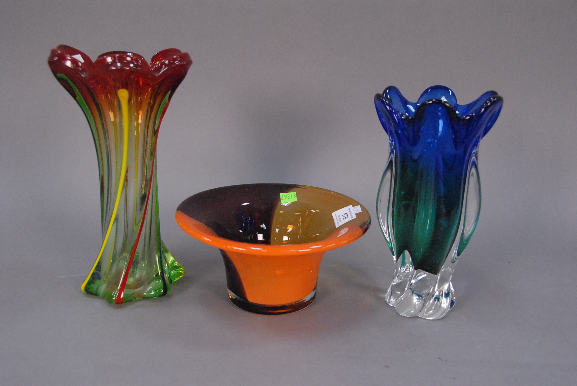 Three art glass pieces including a bowl ht. 4 1/2in. and two vases ht. 9 1/2in. and ht. 11in.