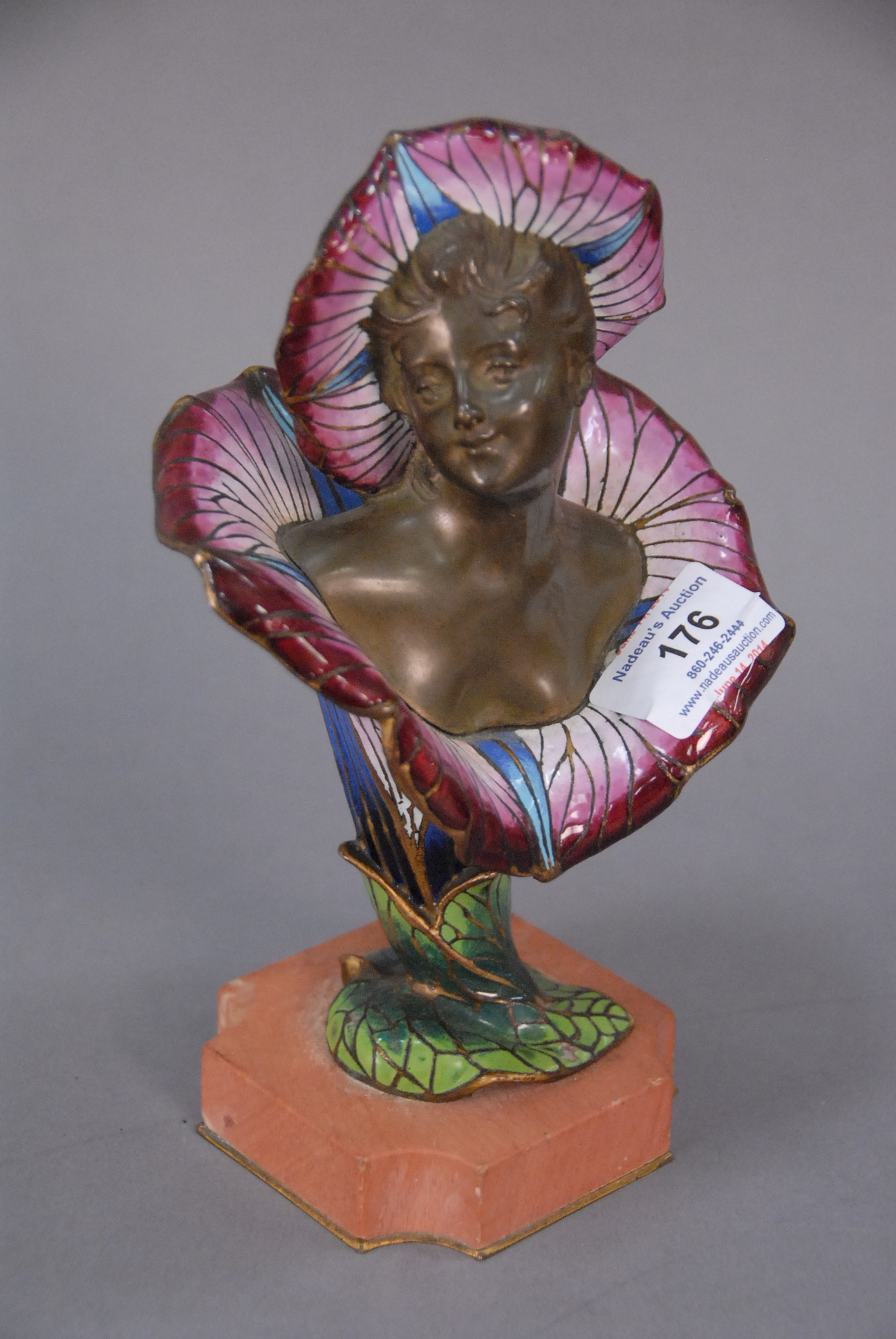 Henri Godet 1863-1937 art nouveau bronze and enamel bust of a woman in a flower cast after a model by Henri Godet, marked on back H. Godet.