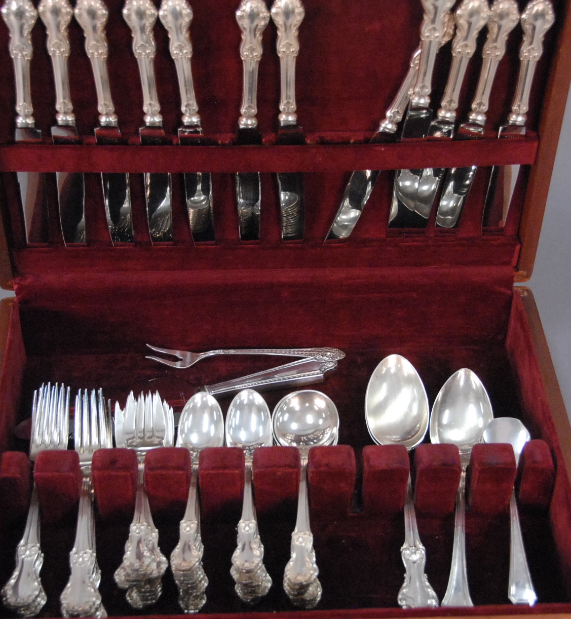Concord sterling flatware set to include 12 dinner forks, 11 salad forks, 24 teaspoons, 12 soup spoons, 12 knives, and 4 serving pieces, 79.8 t oz. plus 13 weighted handles.