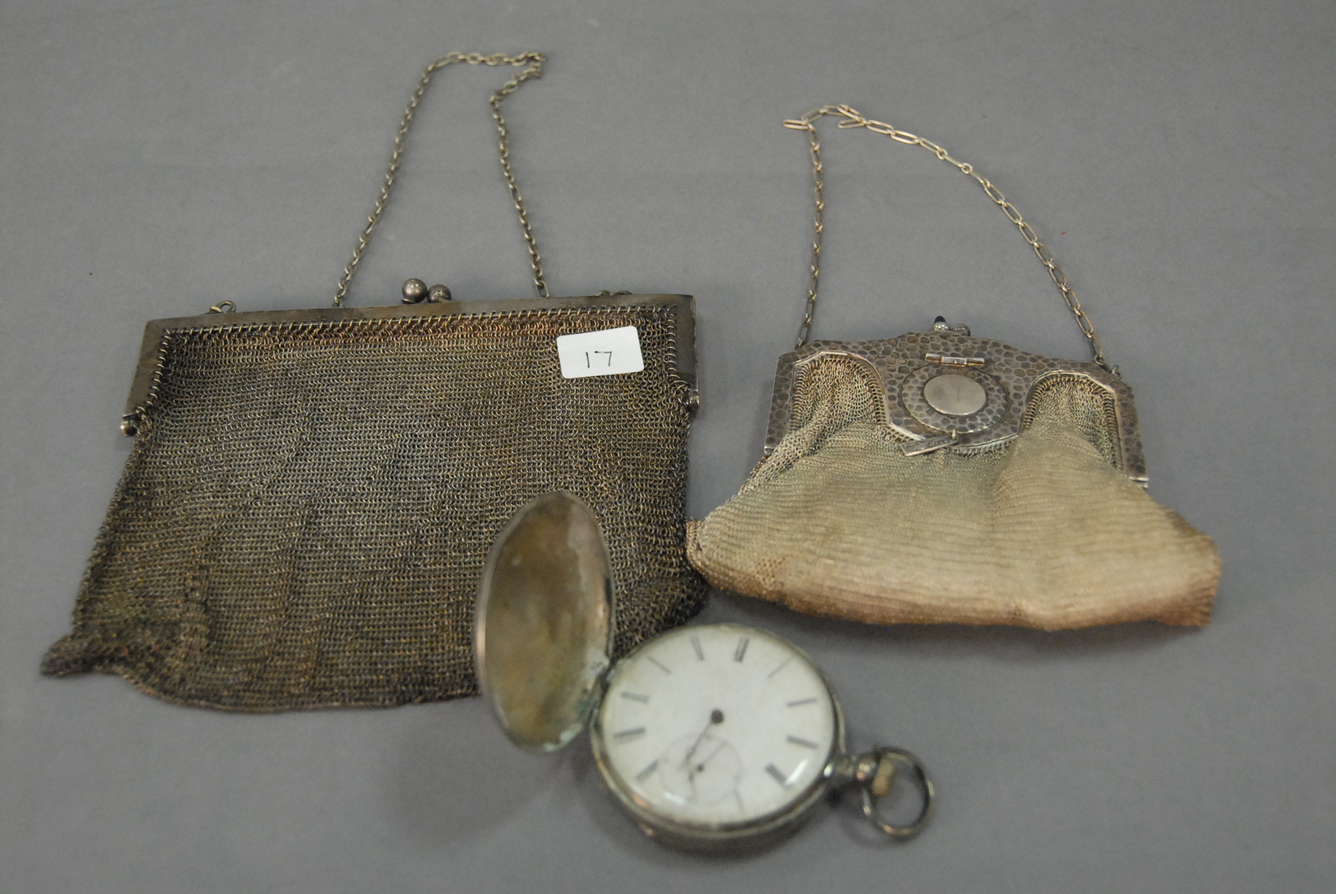 Four piece lot to include two silver purses, silver pocket watch, and a mesh loin cloth along with photo of Far Eastern young girl.
