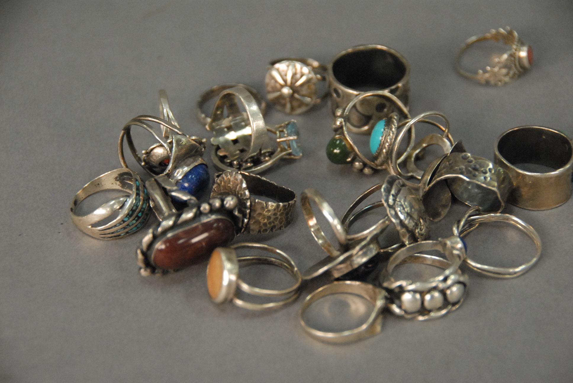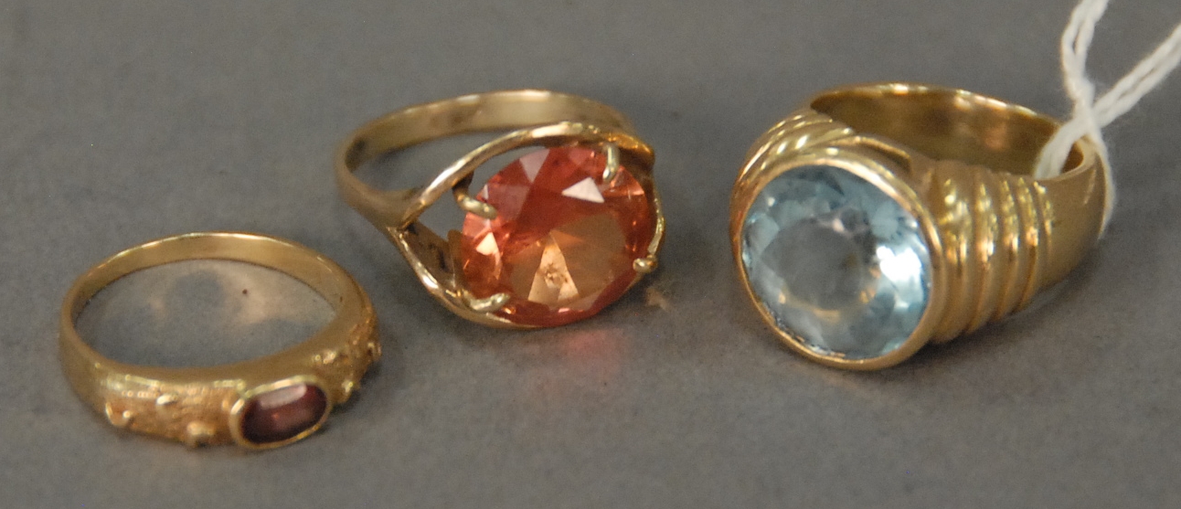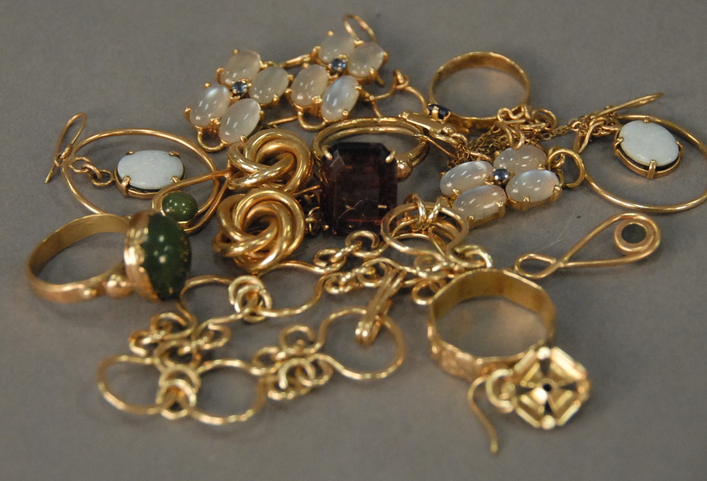14K gold group of miscellaneous gold jewelry, 65 grams total weight including stones.