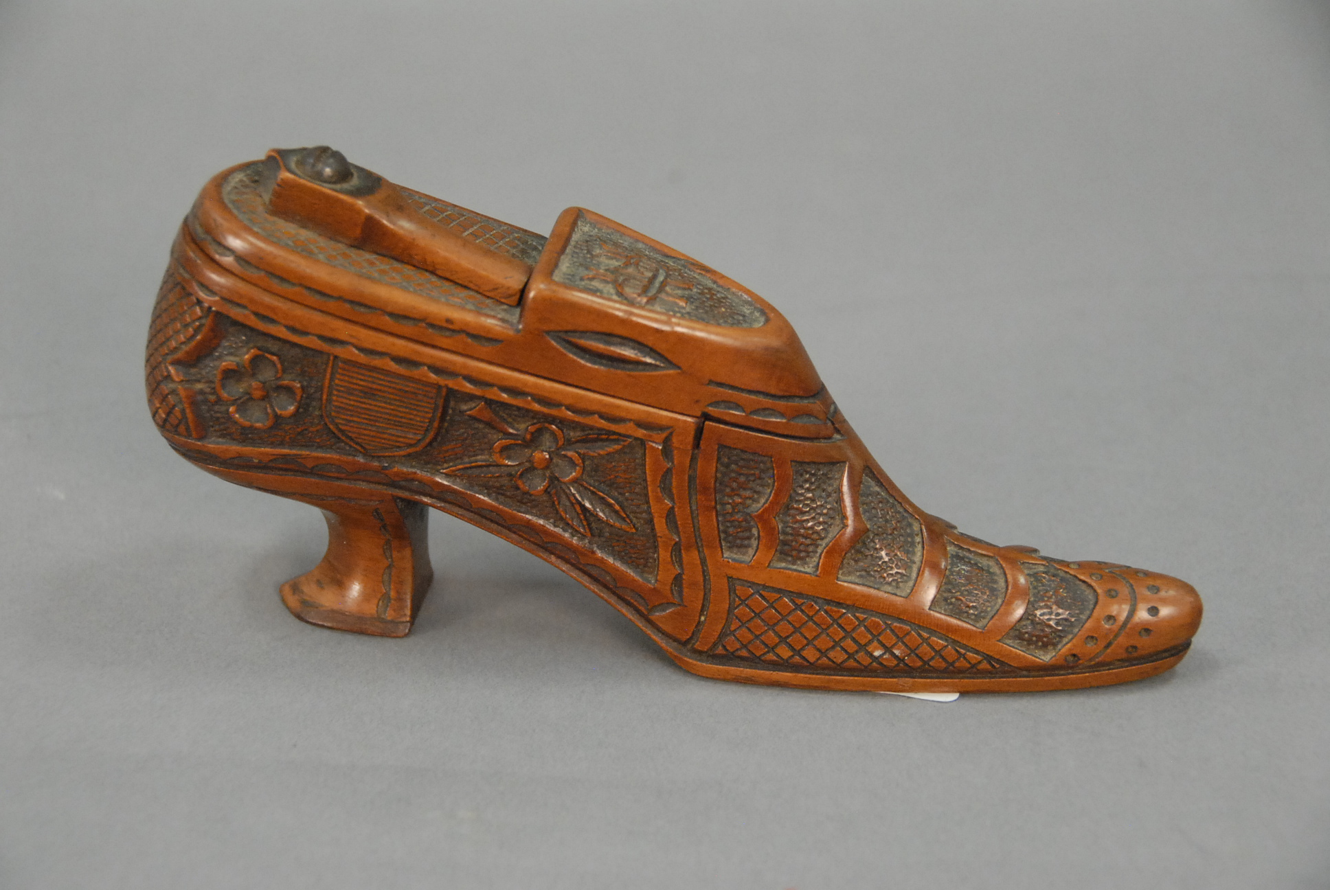 Carved lidded shoe snuff box with twist secret door compartment, ht. 3in. lg. 7in.