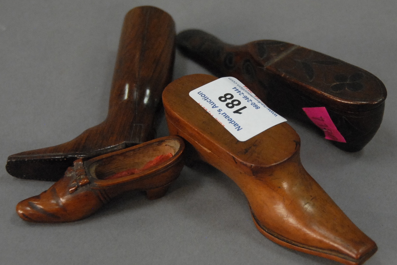 Group of four carved wood shoe snuff boxes, lg. 3 to 5 1/2.