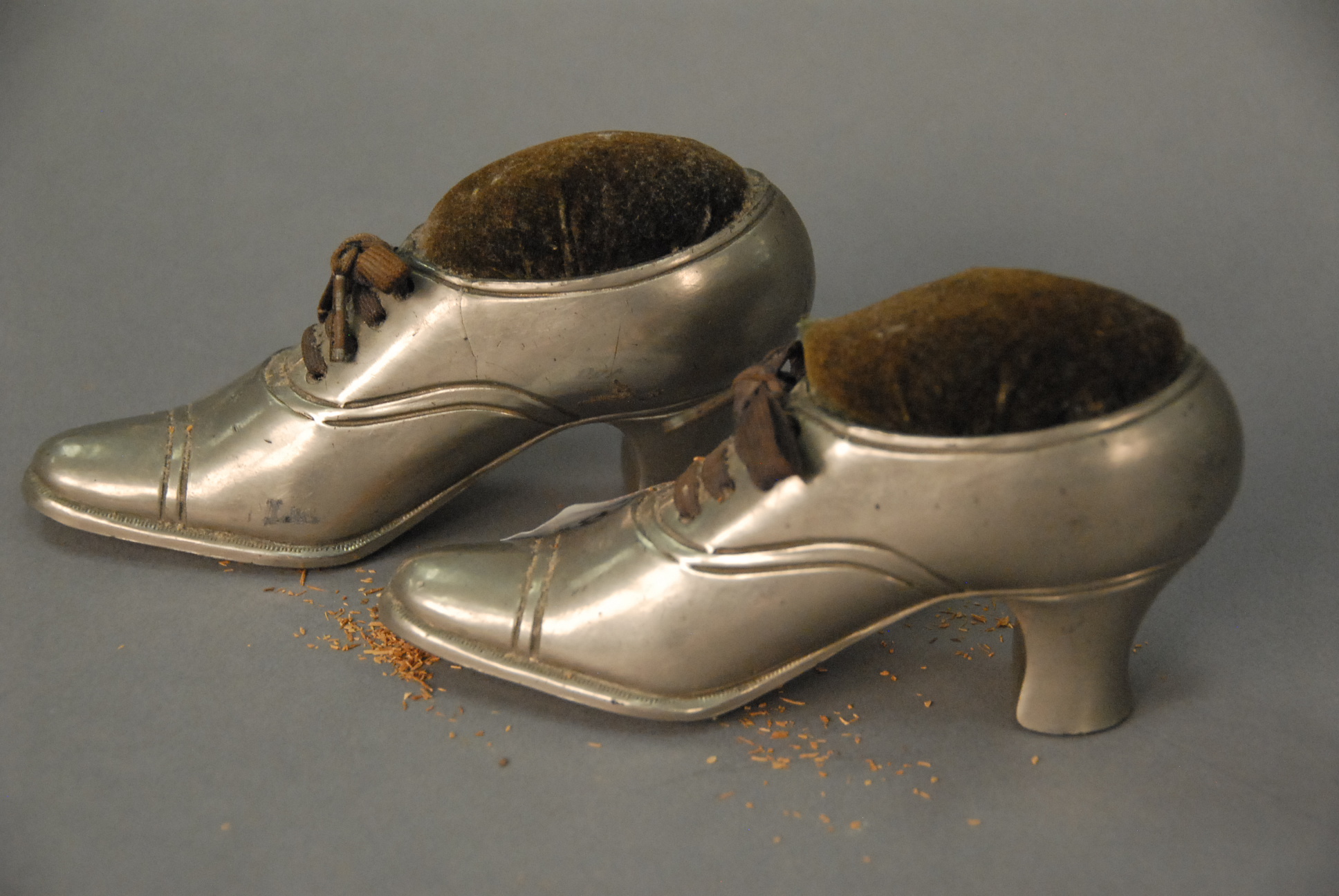 Pair of pewter shoe pin cushions, ht. 3 1/2in. lg. 6in.