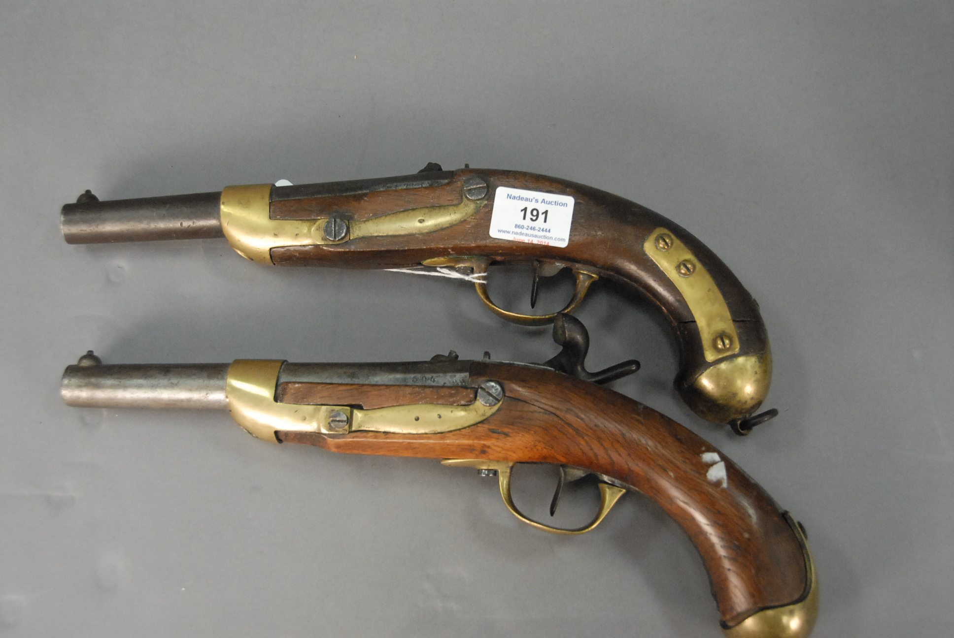 Two European percussion pistols having round barrel with brass fittings, one marked 1829 de 17 Can. both as is, lg. 14in.