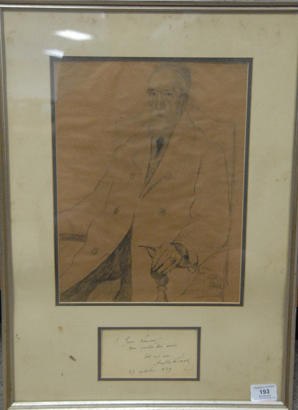 Jean Launois 1898-1942 pencil drawing man sitting in chair signed lower right Jean Launois 1922 with letter on bottom, 13 1/2 x 10.