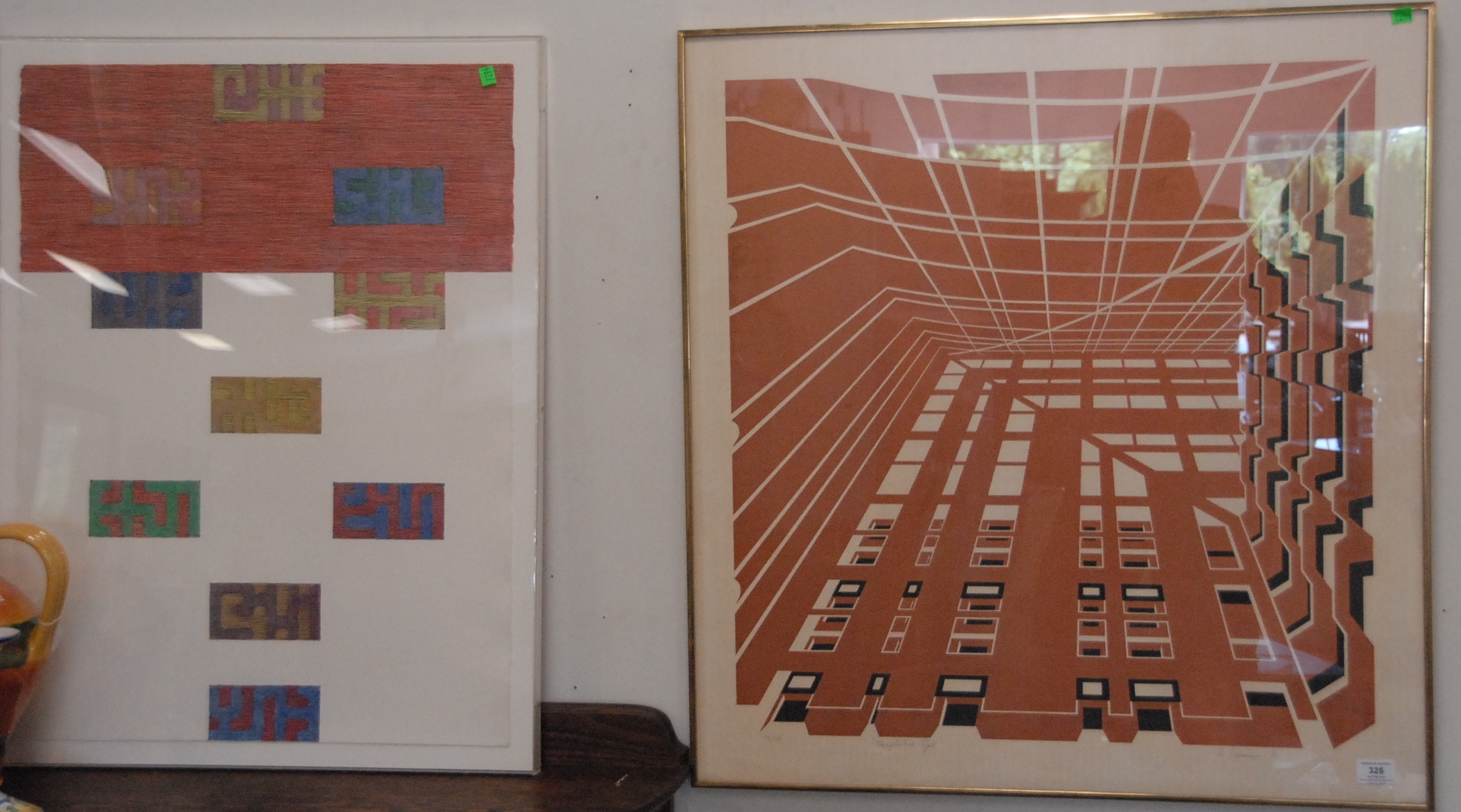 Two framed pieces to include Jess Reichek 1916 Studies from Kabbalah Series mixed media on paper unsigned having Sotheby’s label on reverse 33 x 31 and a geometric design print numbered and signed 30 x 22.