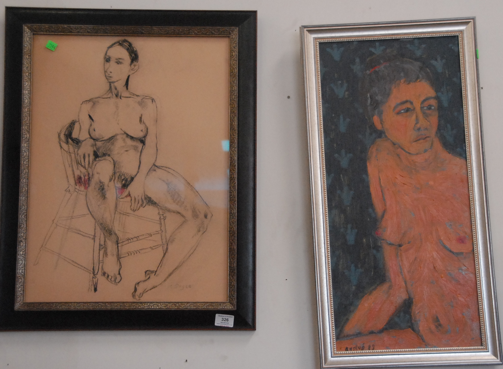 Two paintings including Moses Soyer 1899-1974 charcoal on paper of nude in chair signed lower right M. Soyer 22 x 16 1/2 and an oil on canvas nude signed lower left Bastug 88 25 1/2 x 12.