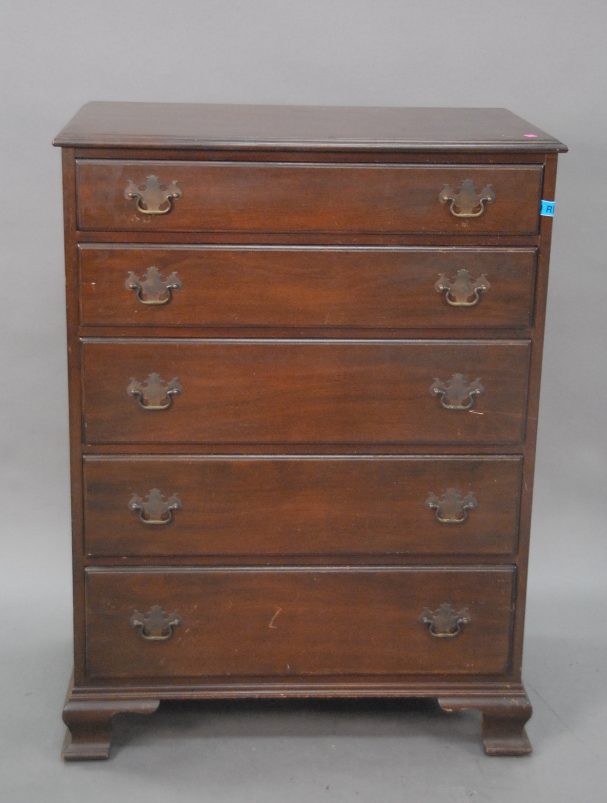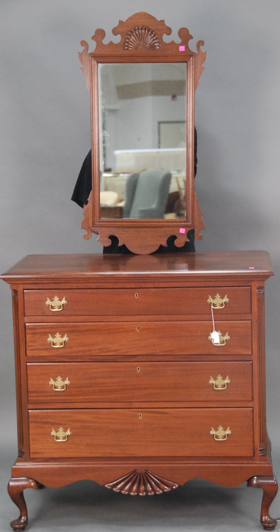 Mayflower Furniture Co. mahogany Salem chest and mirror and four post double bed. chest: ht. 38in. wd. 39in.