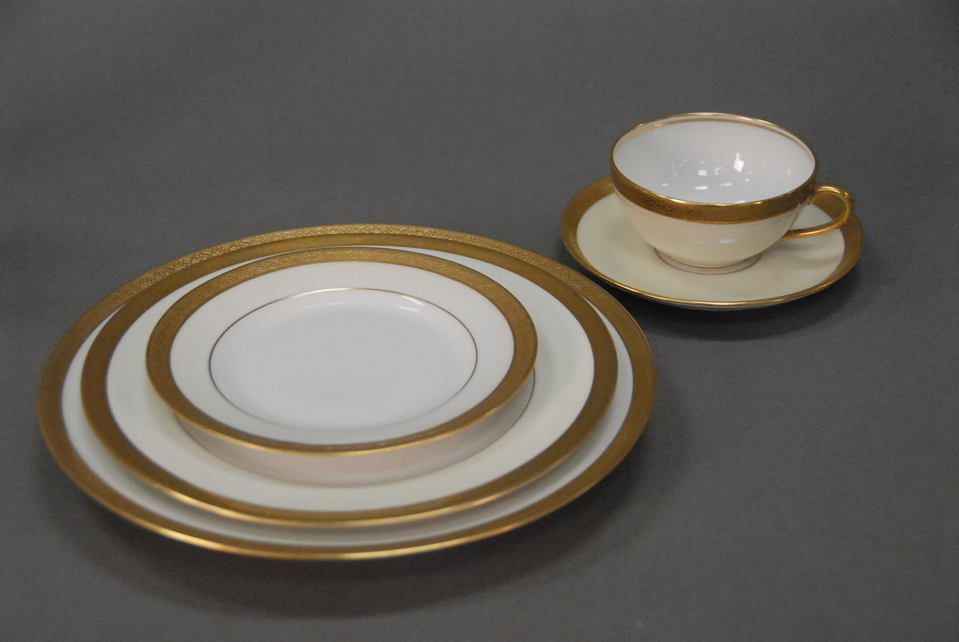 Large Limoges china grouping with raised gold borders, Old Abbey from Stern Brothers NY, several close to matching patterns, 121 pieces total.