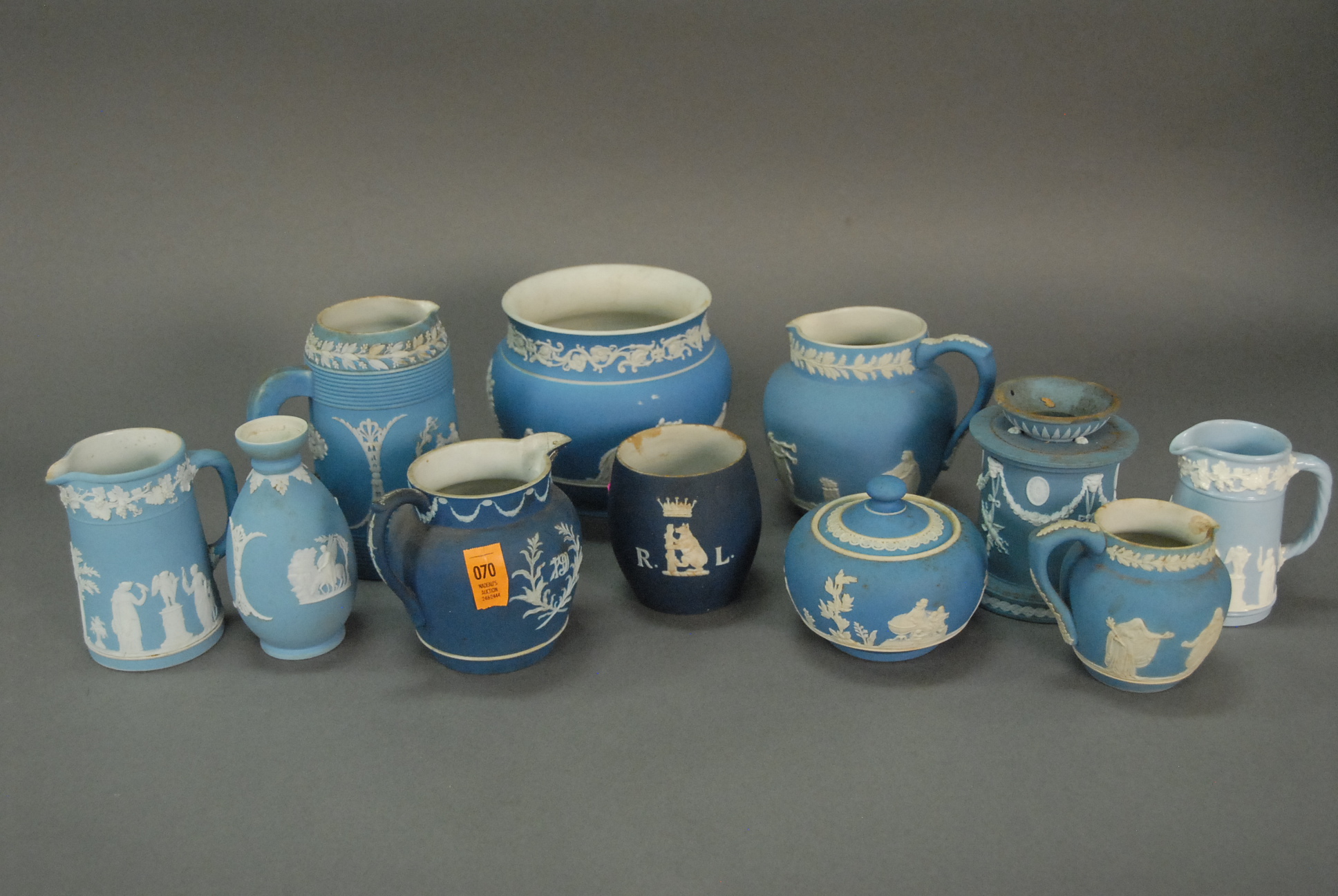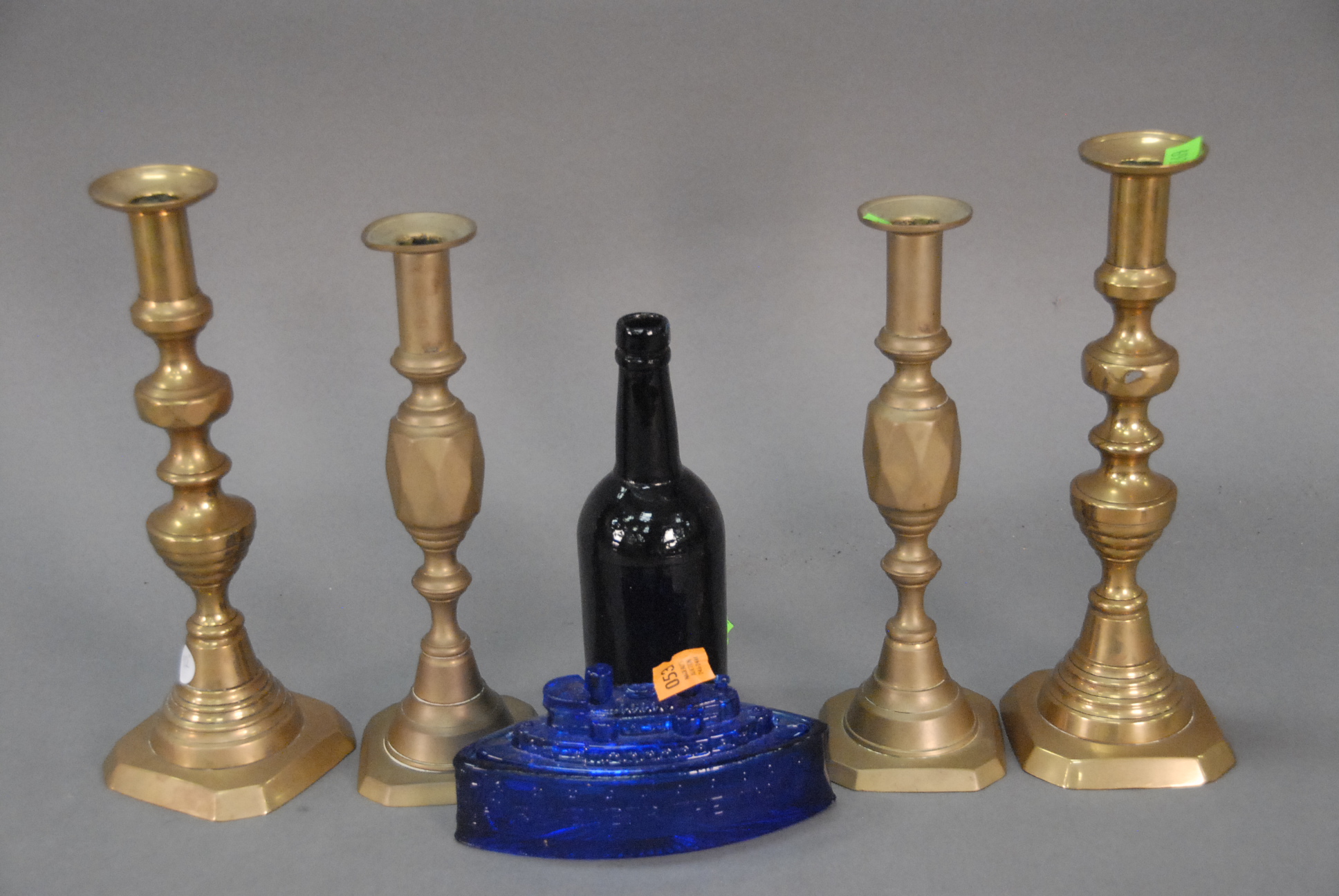 Lot to include two pairs of brass push-up candlesticks, cobalt ship container, and early bottle.
