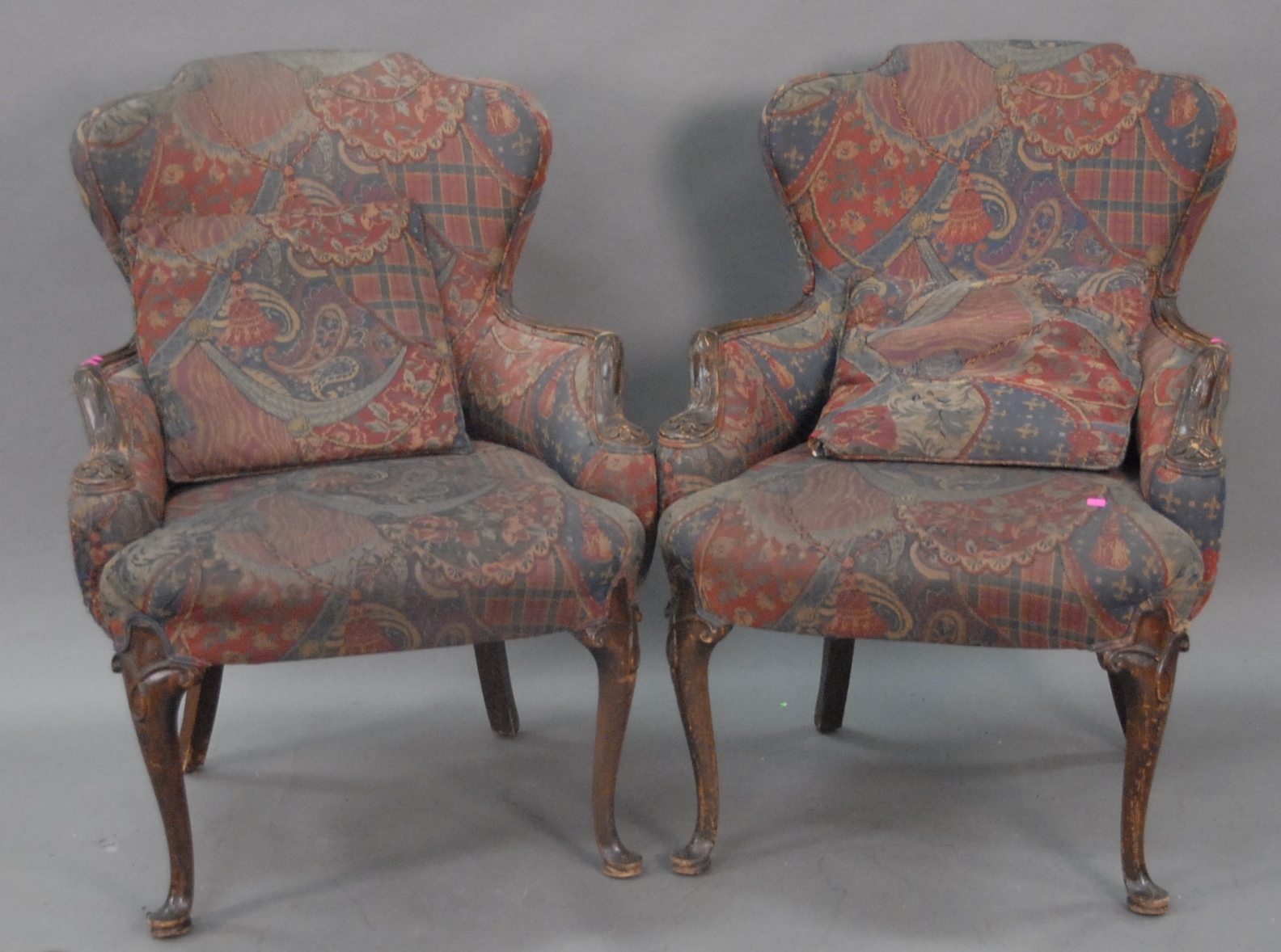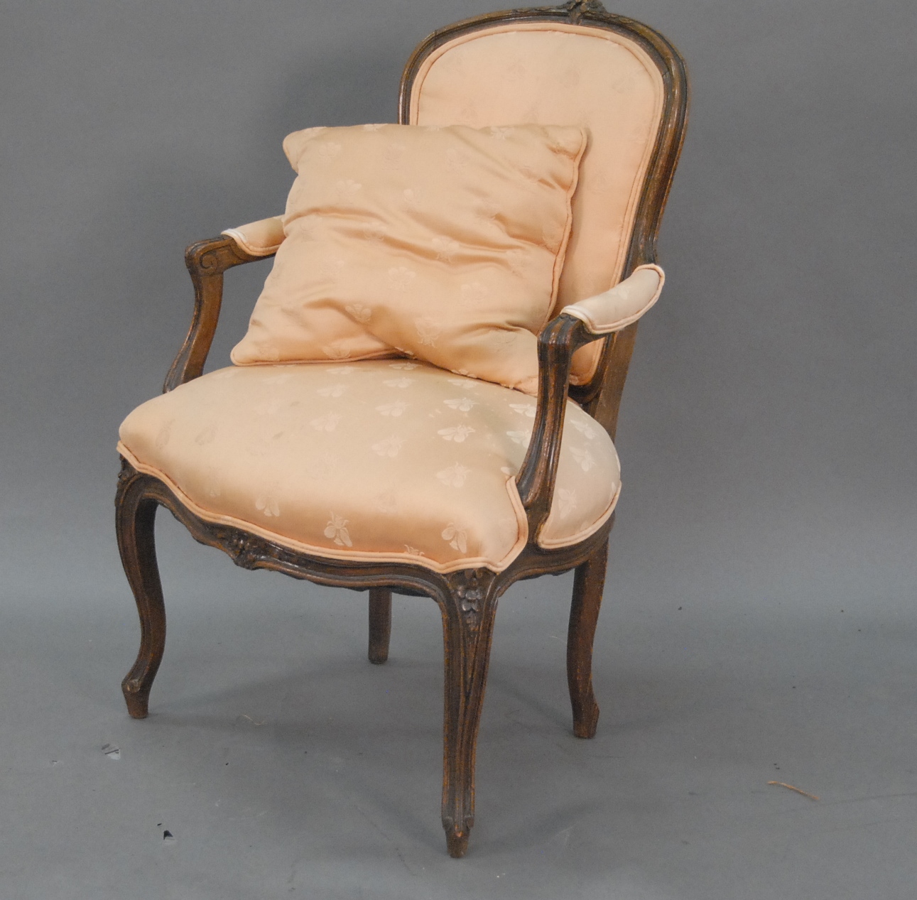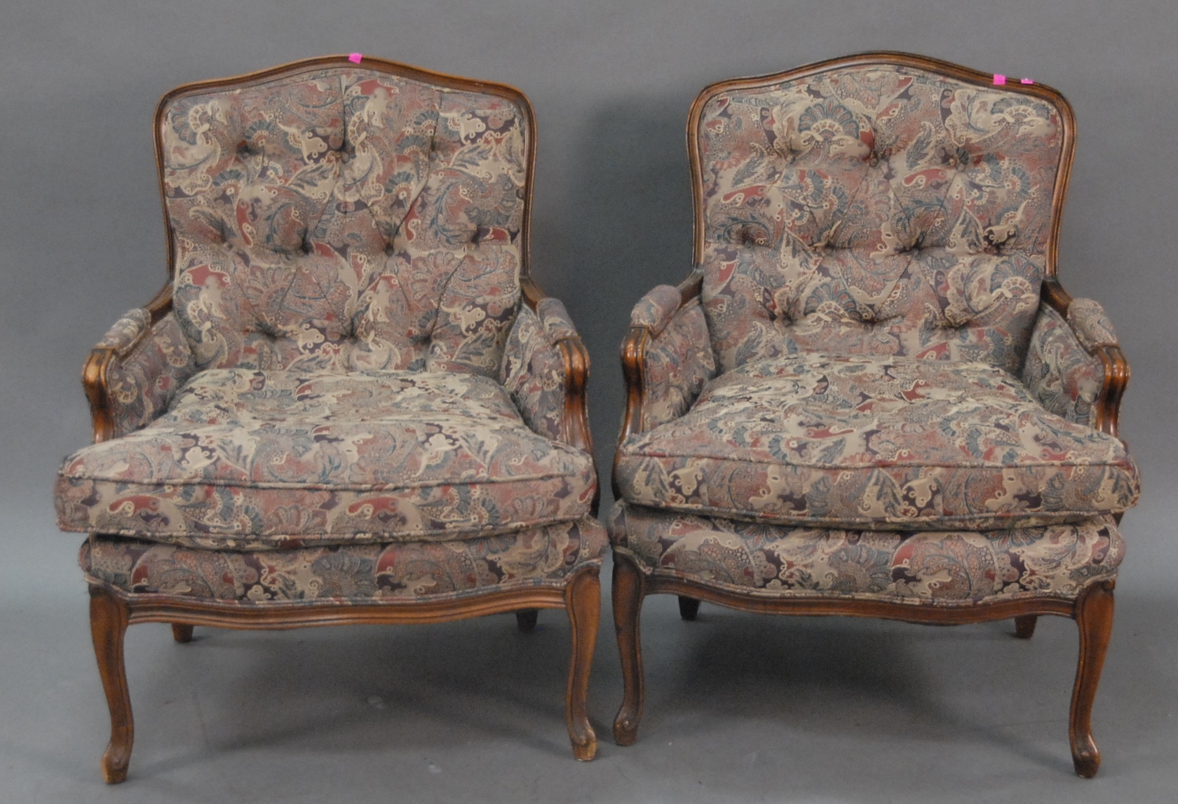 Pair of Louis XV style upholstered armchairs with tapestry style upholstery.
