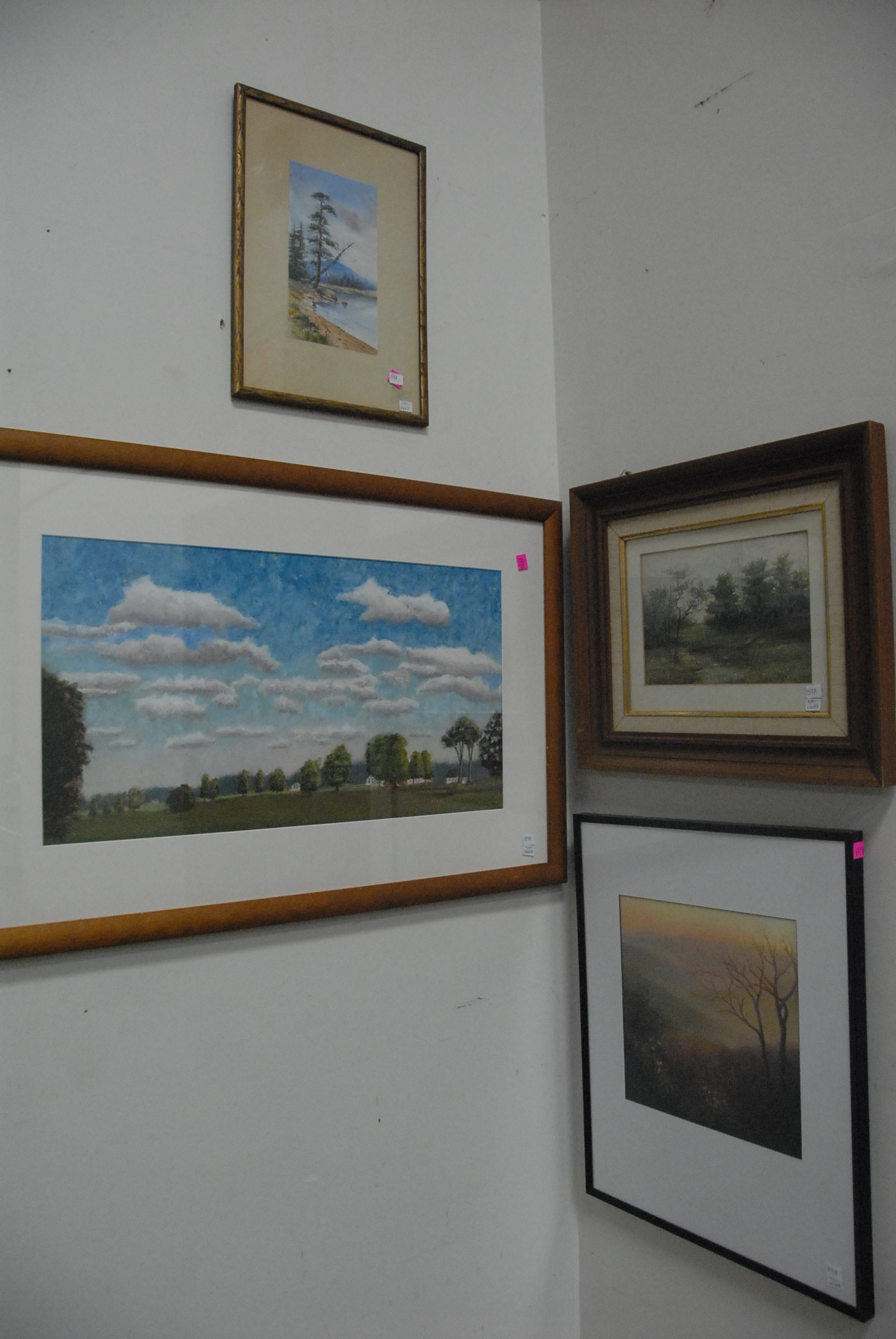 Group of four paintings to include a pastel sunrise, watercolor of stream, watercolor of lake’s edge, and mixed media sunny skies.