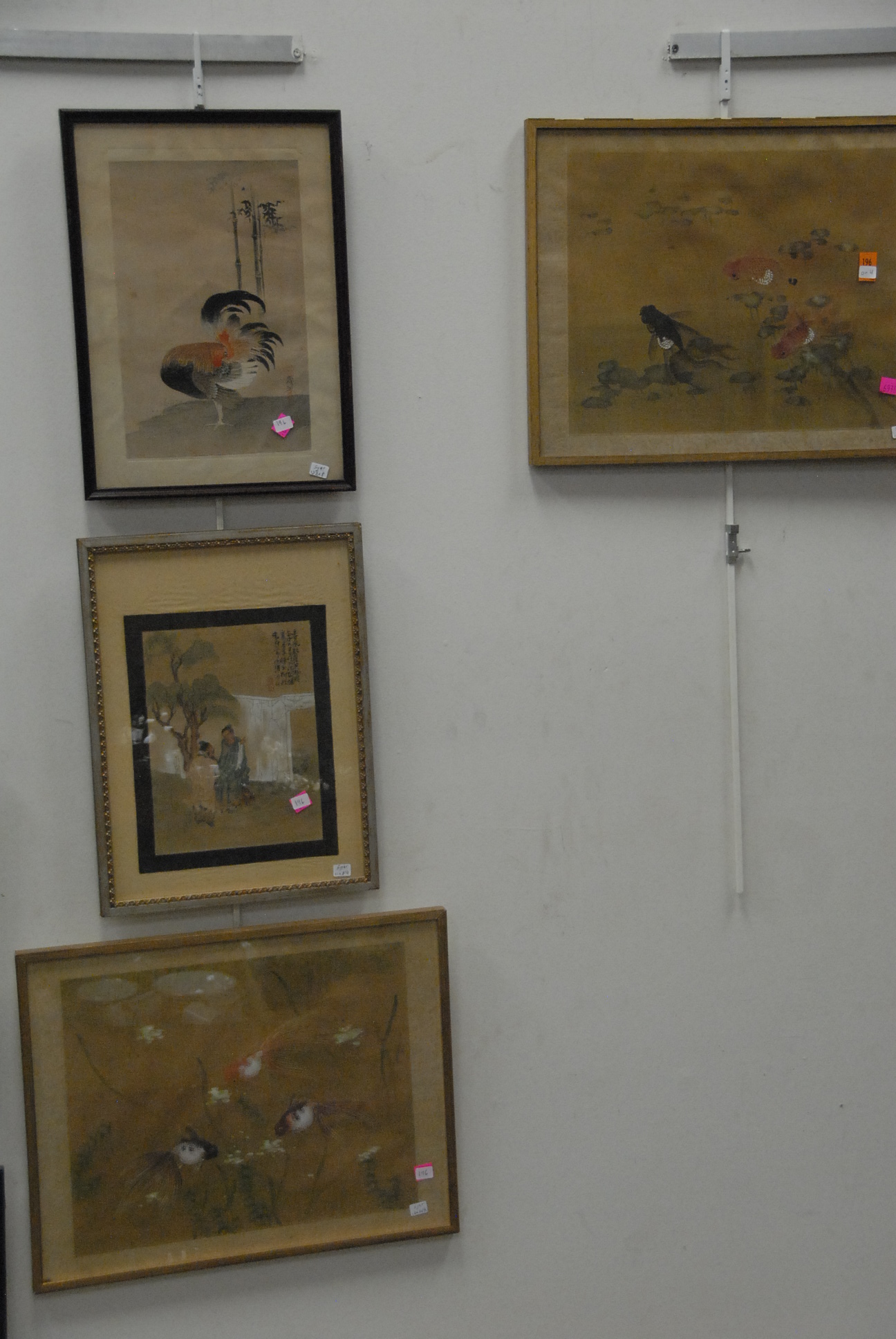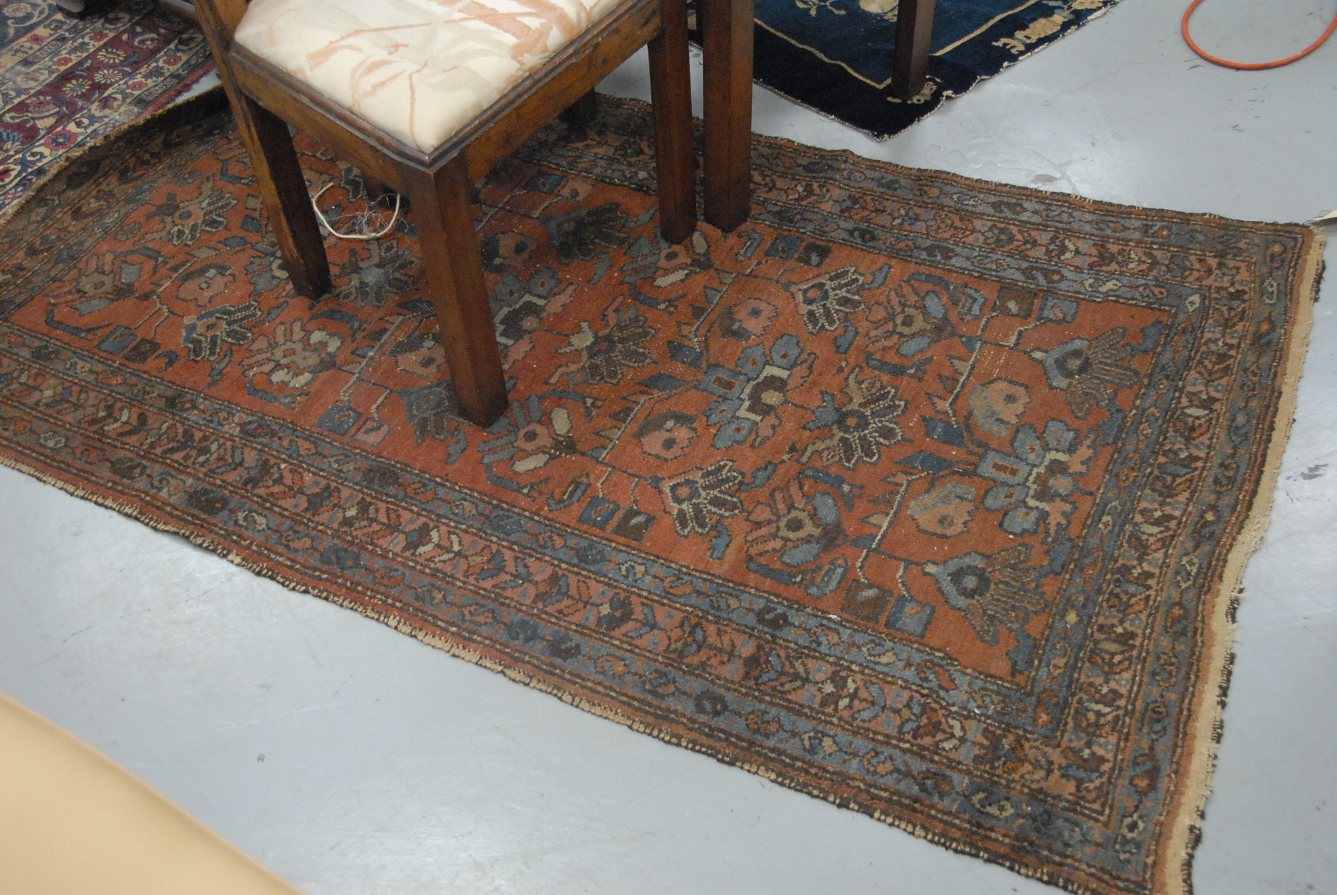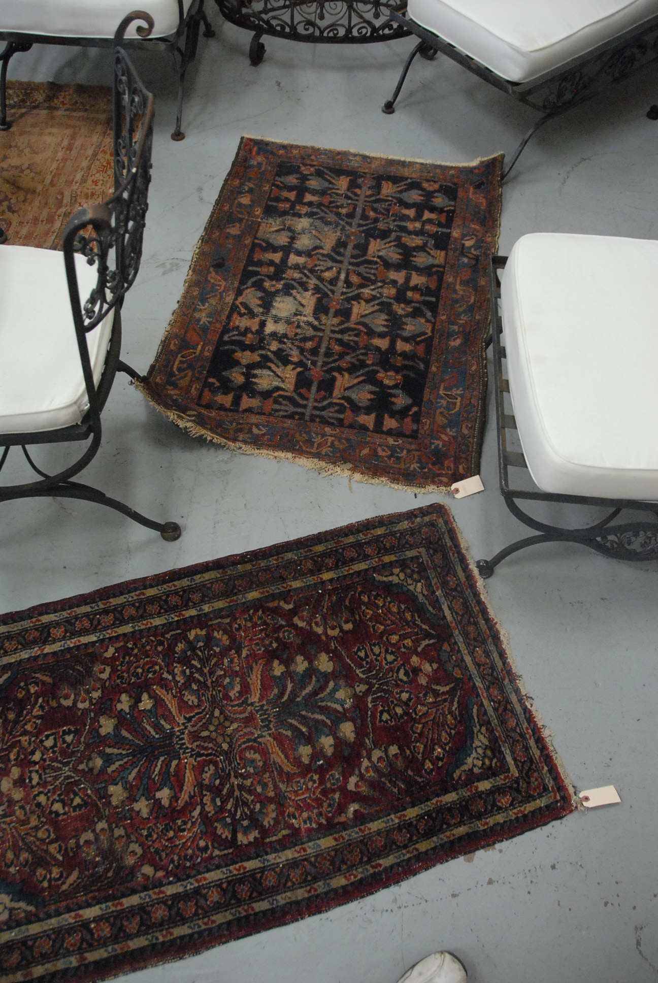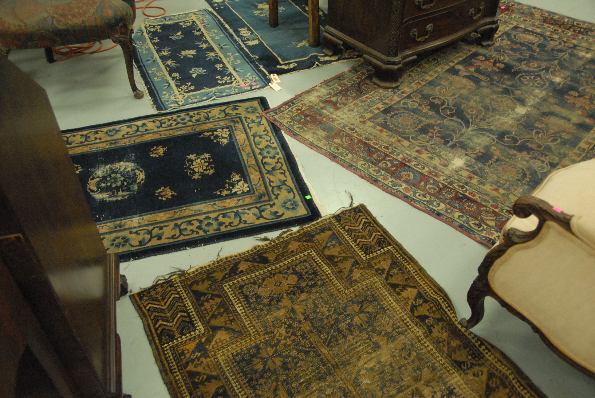 Group of eleven antique Oriental rugs, all with wear, four are Chinese, one Beloush, one machine made, and one Kirman, 2′ x 3’10, 2′ x 3’8, 3′ x 4’10, 1’6 x 1’7, 3′ x 3’7, 5′ x 6’10, 2’10 x 4’7, 2’9 x 5’4, 1’11 x 3’7, 5’3 x 7’7, and 3’2 x 11’2.