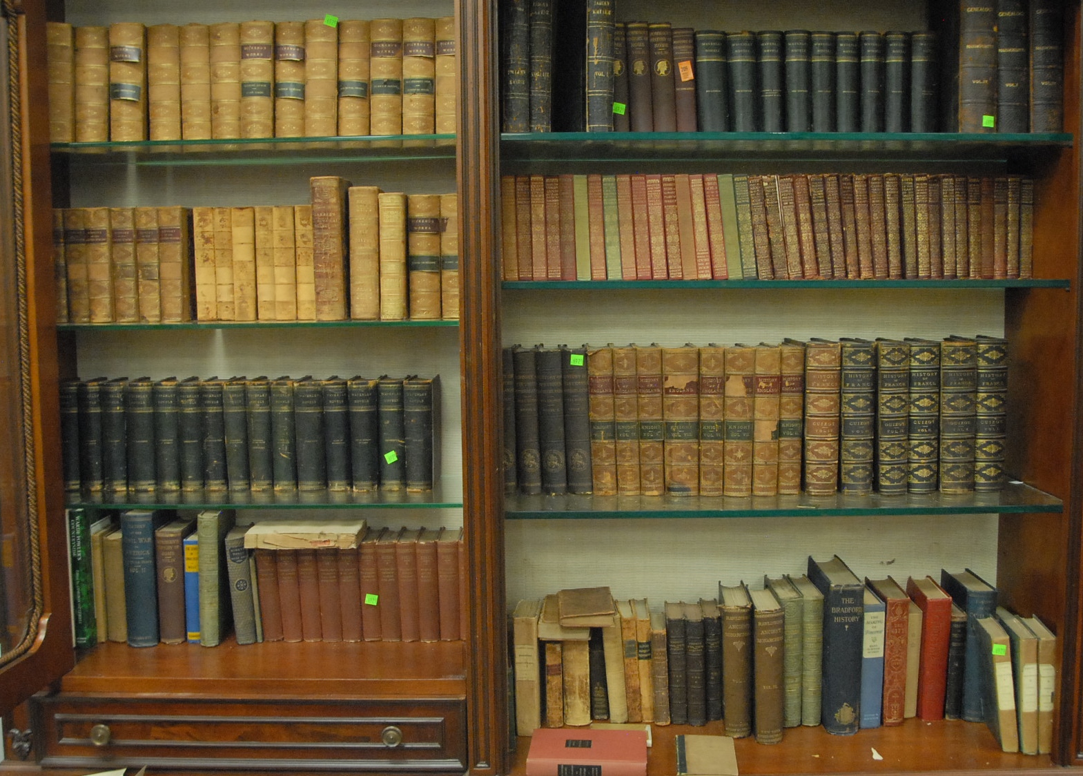 Group of books, several shelves, including leather bound books, History of the US, Dickens Works with leather binds, Indian Empire volume 1, 2 & 3, Genealogy of Massachusetts 1, 3 & 4, early 19th & 20th century books.