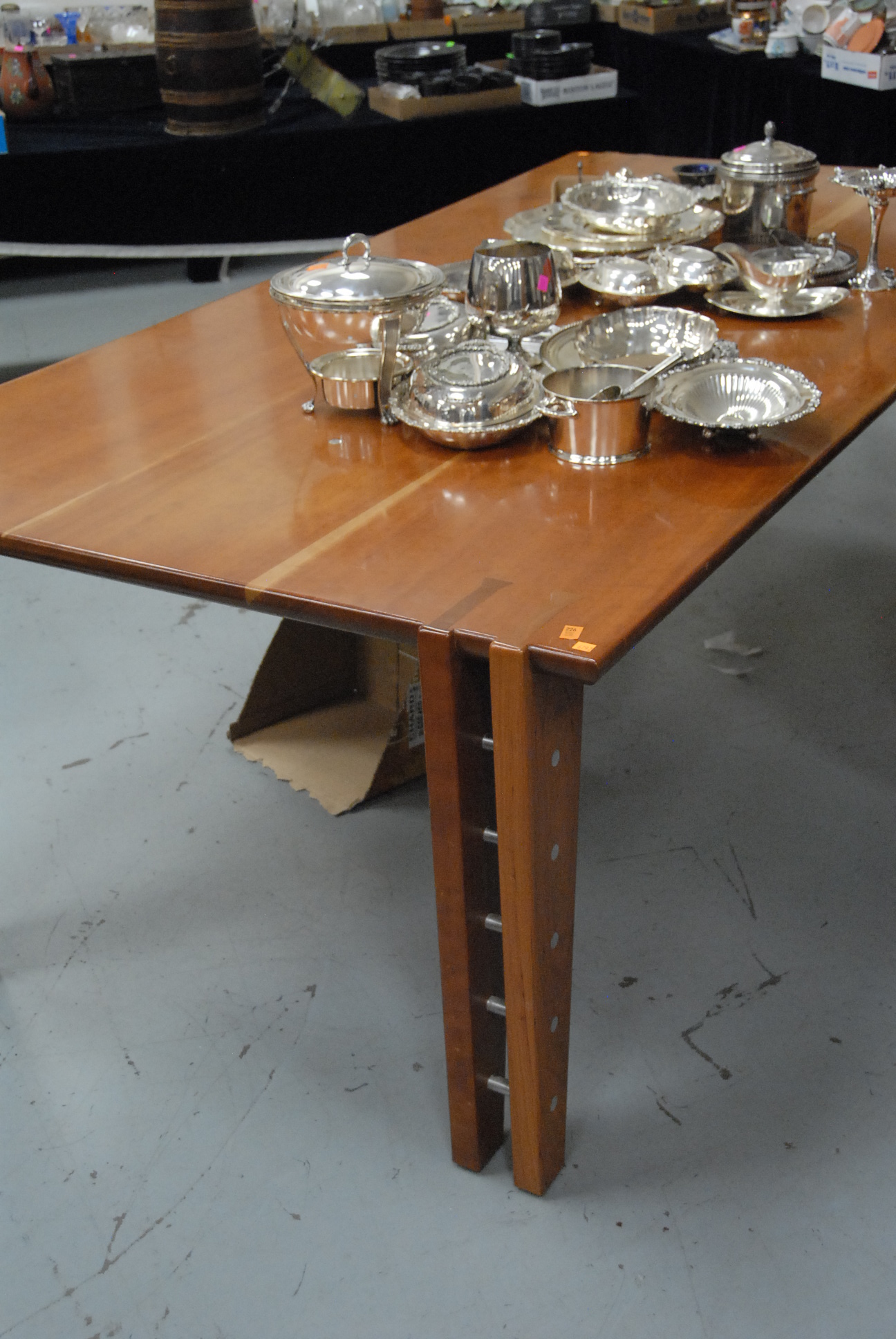 Studio Craft Movement custom dining table of solid cherry with aluminum accents with the top supported by four sets of parallel legs with aluminum spacers each leg set dovetailed in to the top at each corner, C.1990, ht. 29 1/2in. top: 48 x 96.