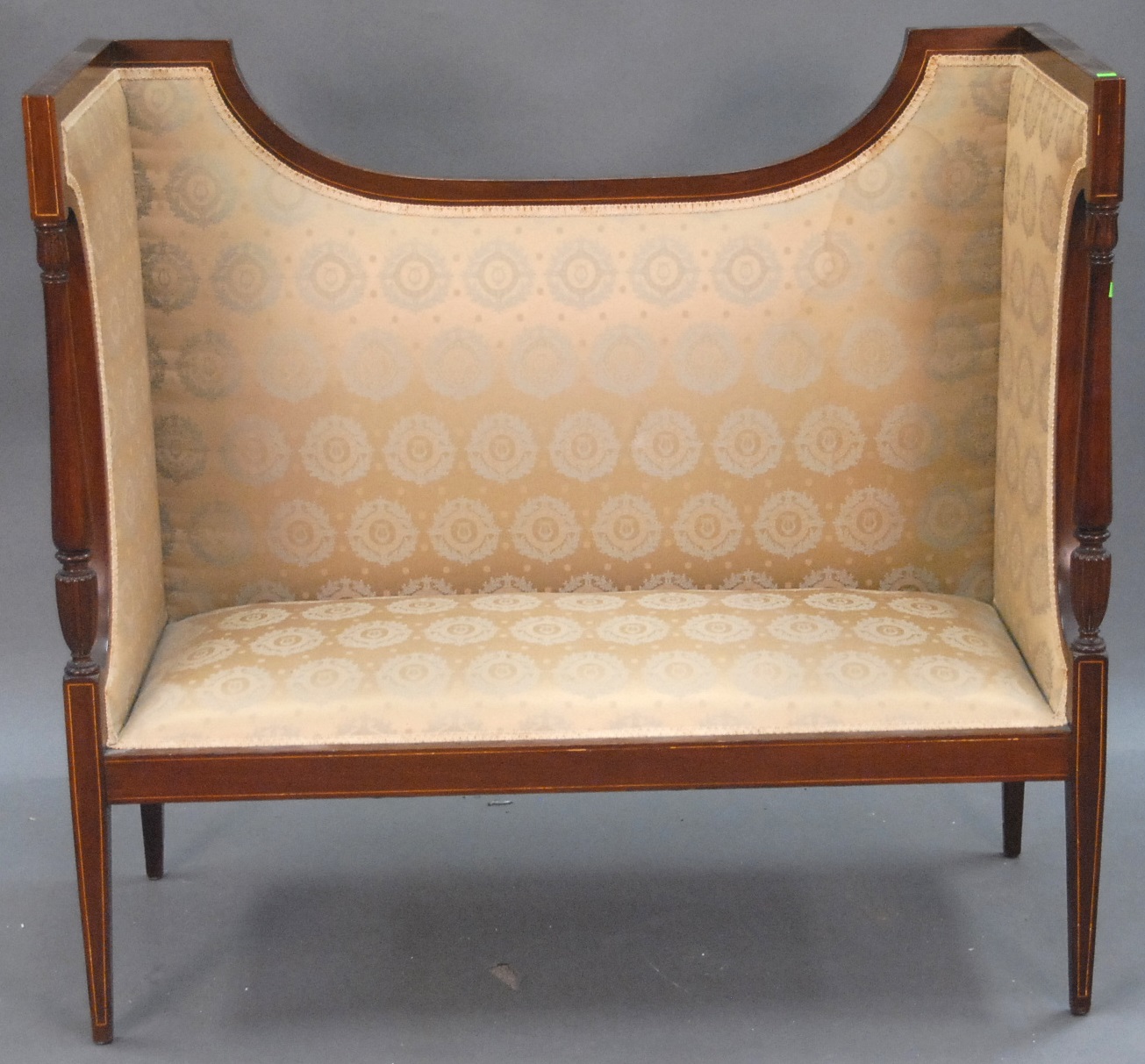 Kittinger Colonial Williamsburg Chippendale style sofa with camel back and rolled arms on plain square legs and stretchers signed on leg. lg. 84in.
