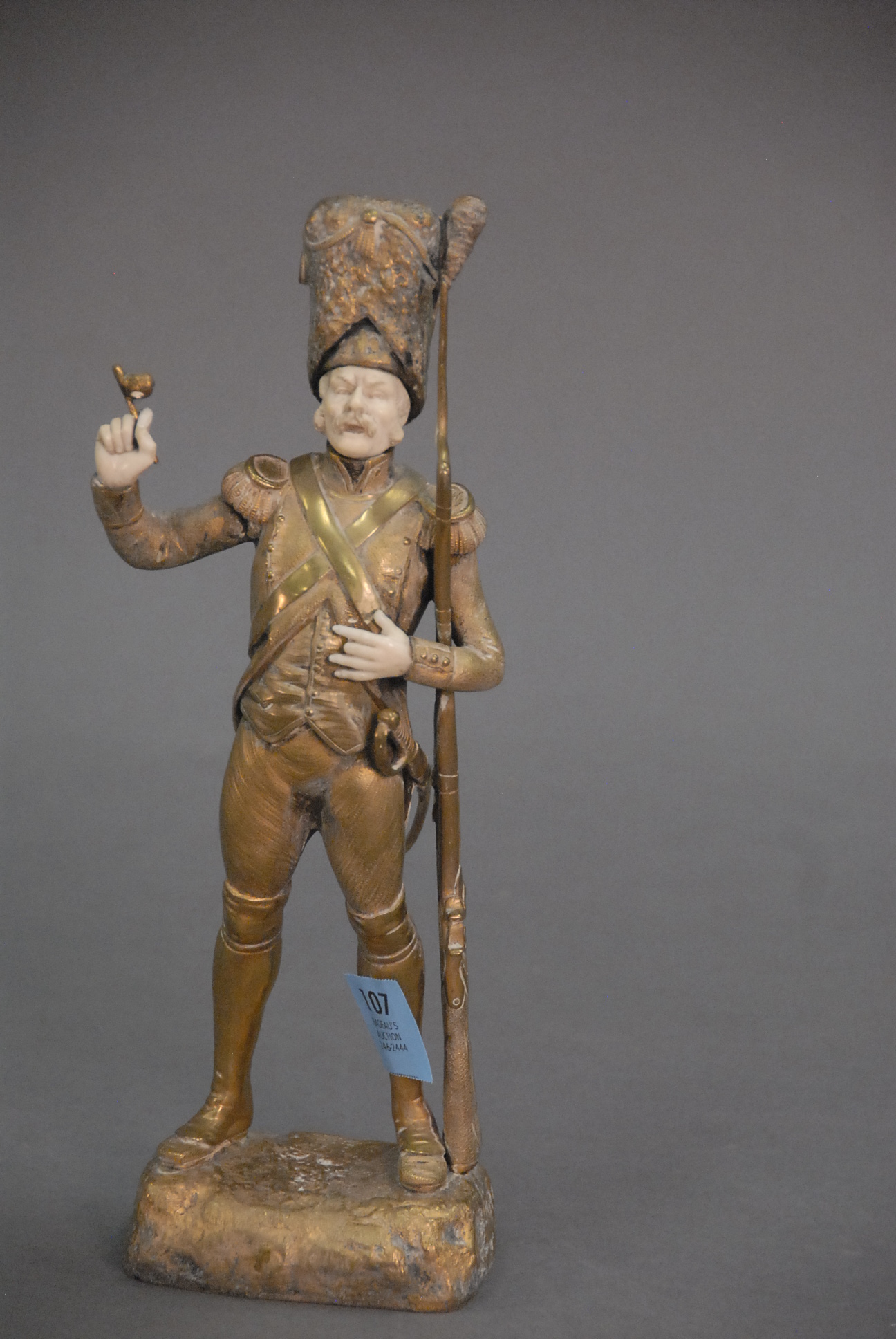 Bronze soldier figure with ivory head and hand with pipe in hand and gun by his side, signed Omerh