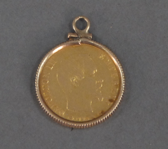 Ten Frank 1860 gold coin with frame, 4.1 grams.
