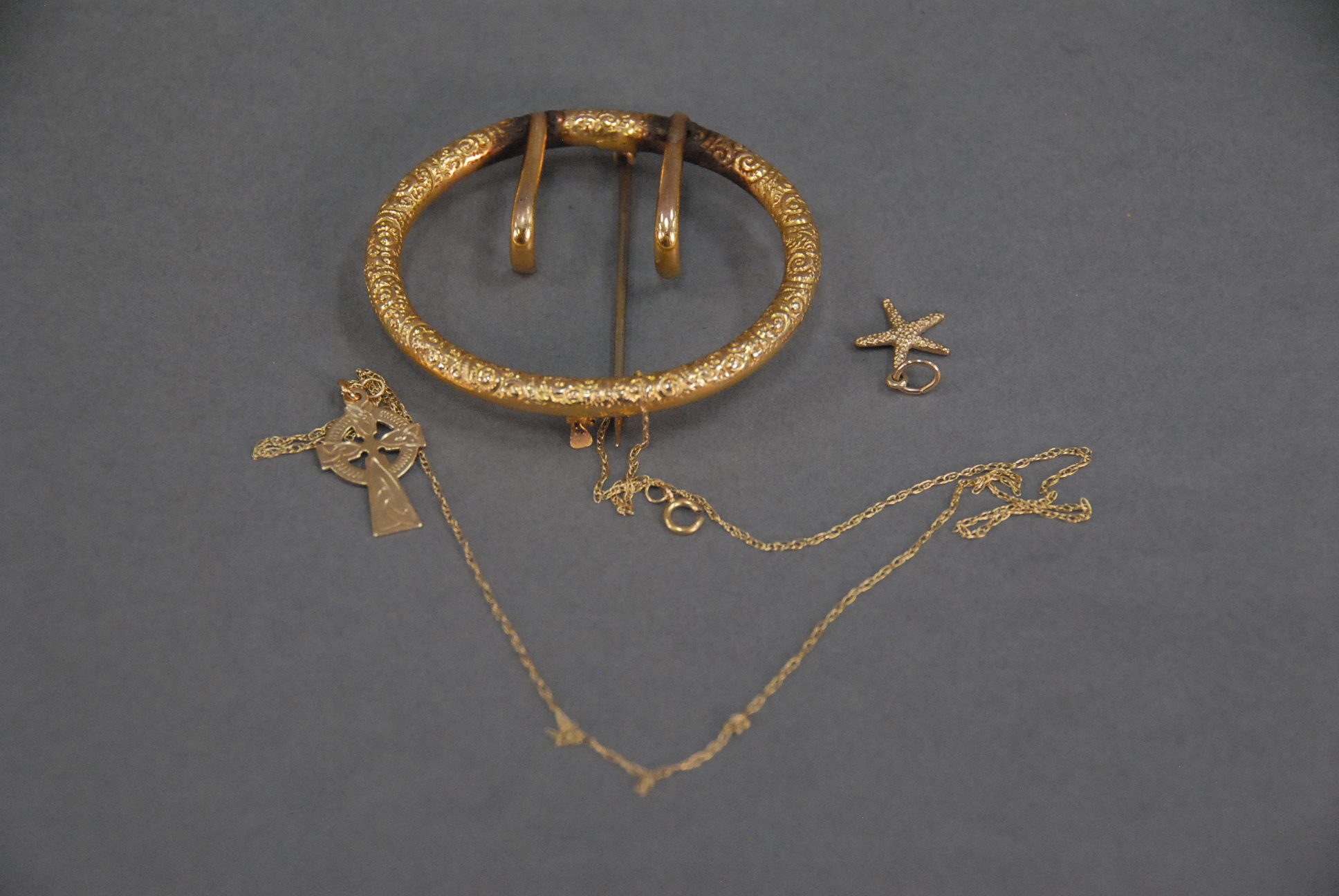 Group of 10K gold including belt buckle made into brooch and chain and cross, 10.9 grams.