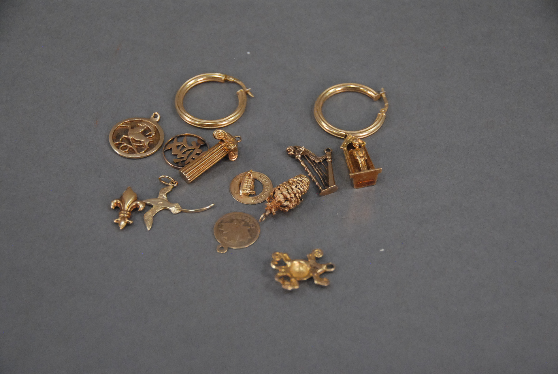 Group of gold charms, mostly 14K, one 10K, and one 18K, 22.8 grams.