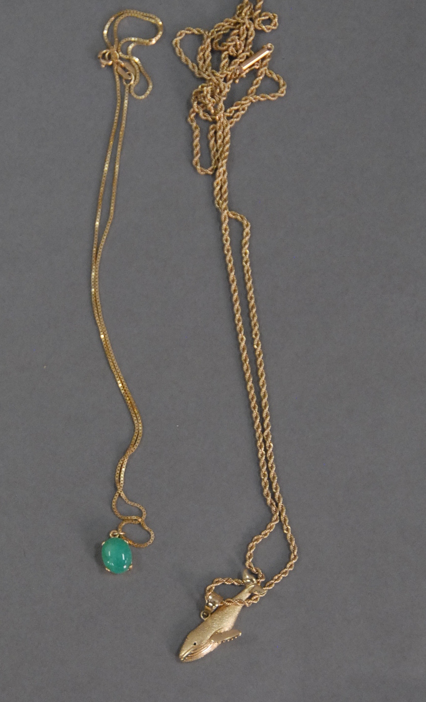 14K gold lot to include two chains with pendants one of whale and one green jade.