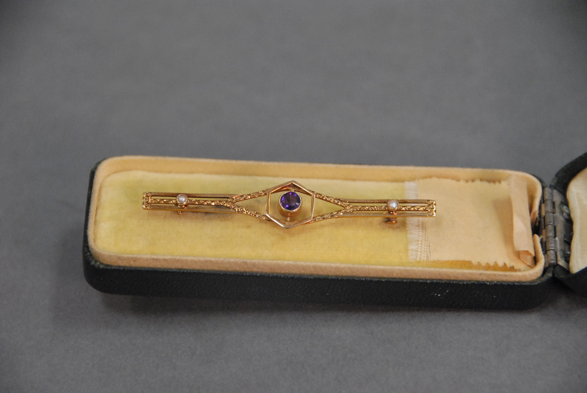 14K Victorian bar pin mounted with amethyst and two small pearls, 2.6 grams.