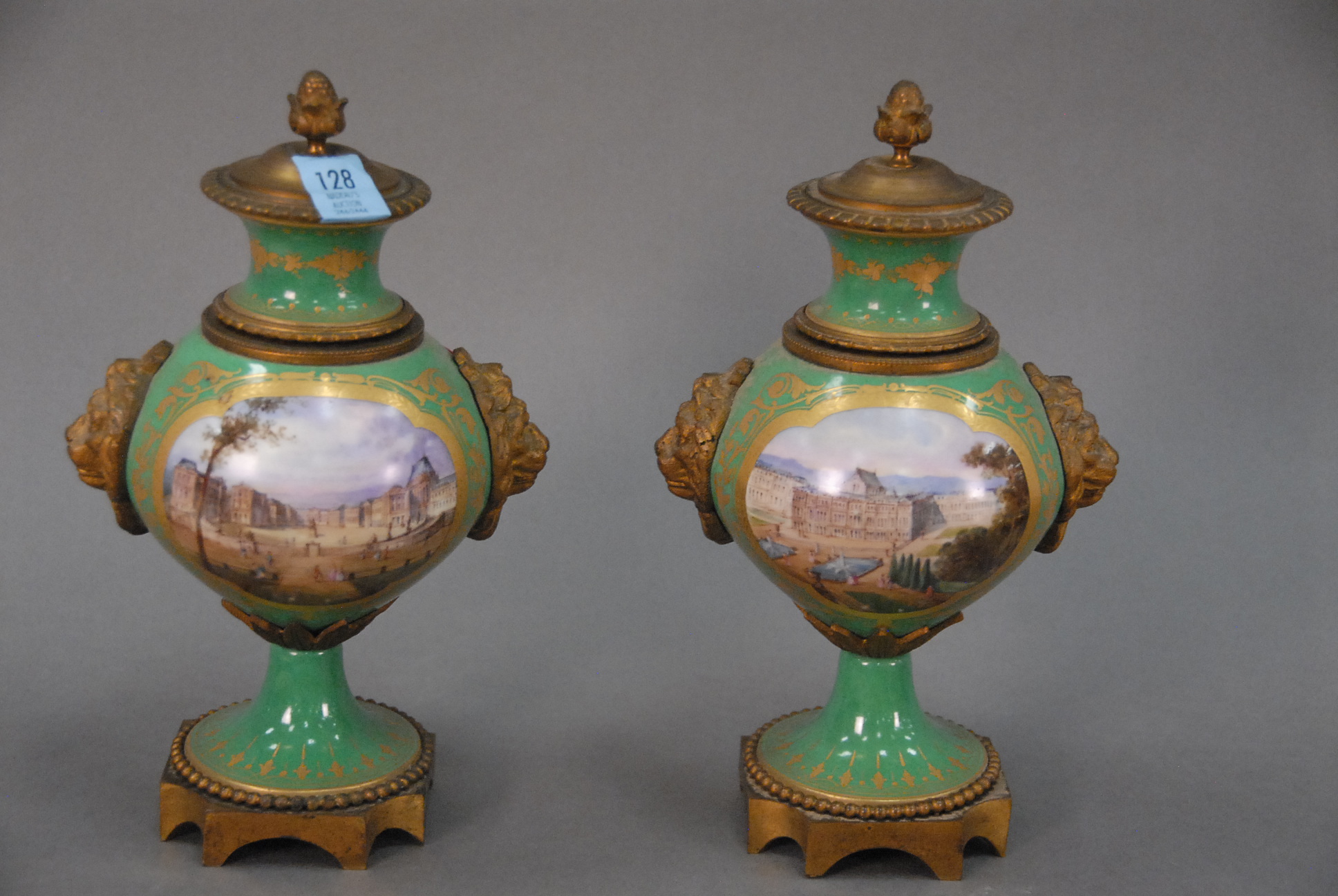 Pair of French porcelain urns metal mounted with hand painted scenes.