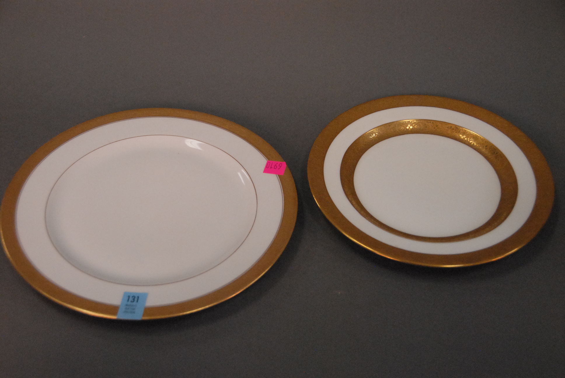 Two sets of twelve plates including luncheon plates and dinner plates, two patterns, one Cauldron and one is Limoges with raised gold borders.