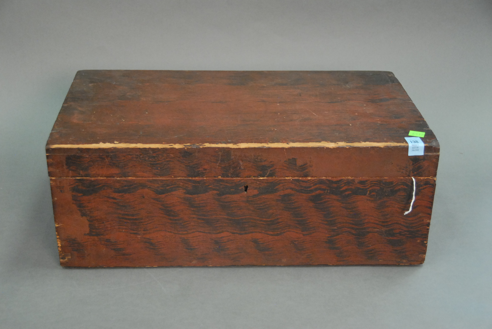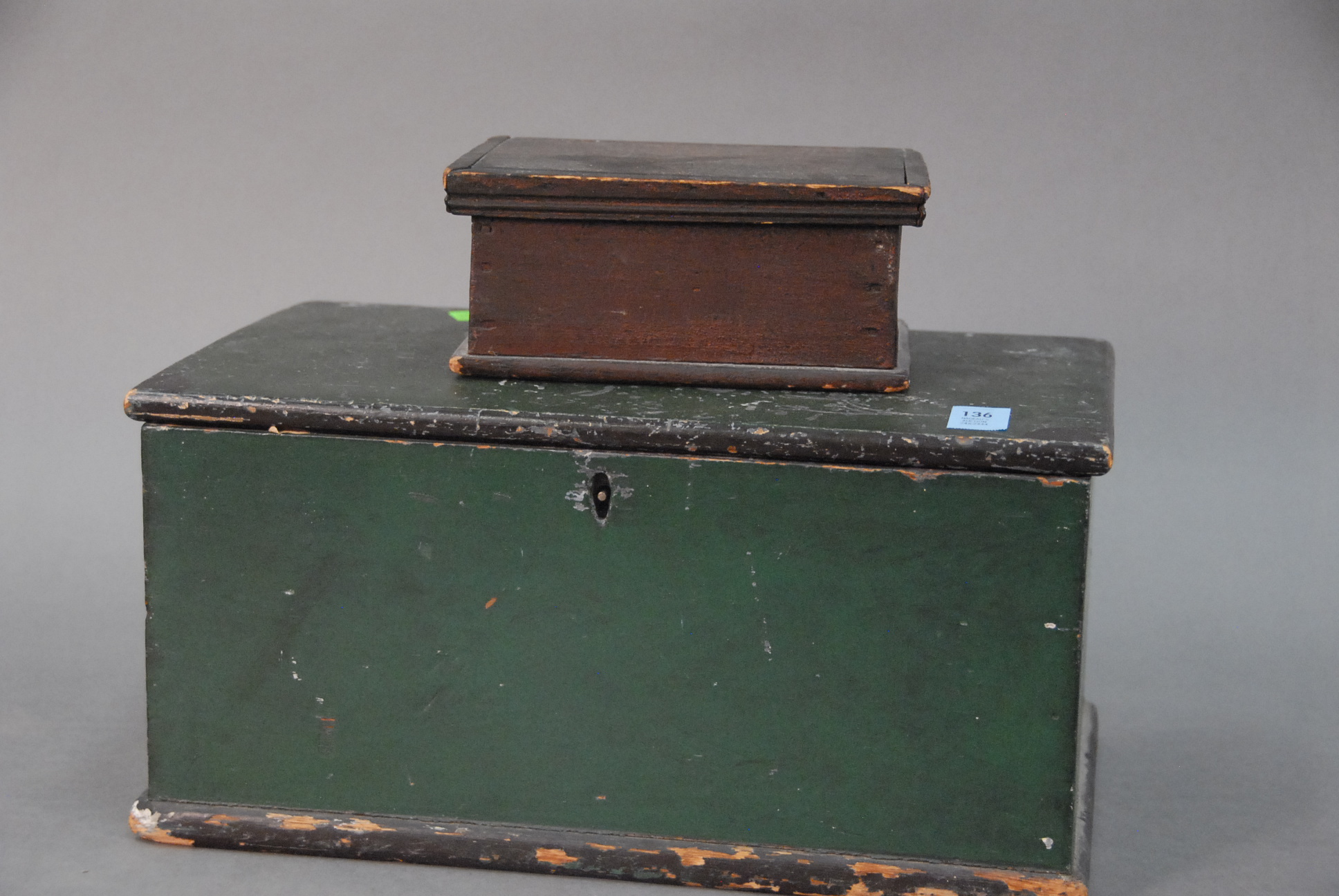Two lift top boxes, one green and black paint with grey pipes inside and other small in old red paint.