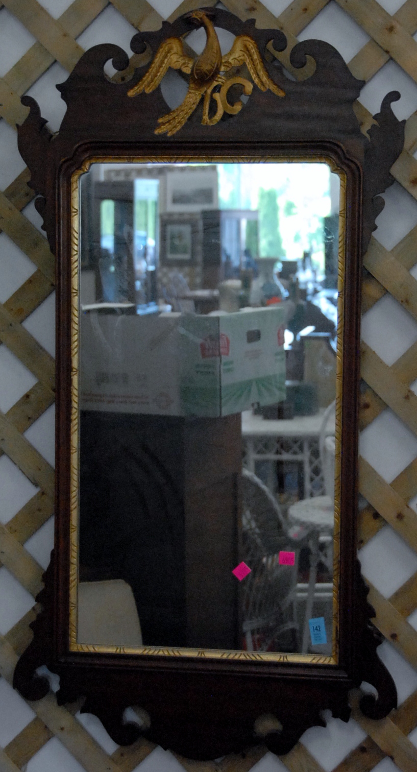 Signed Margolis mahogany Chippendale style mirror with phoenix bird top.
