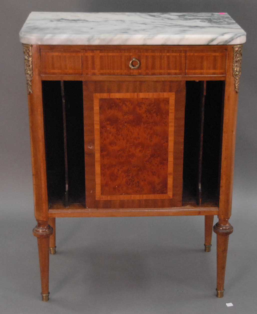 Louis XVI style cabinet with marble top, drawer, and record holders.