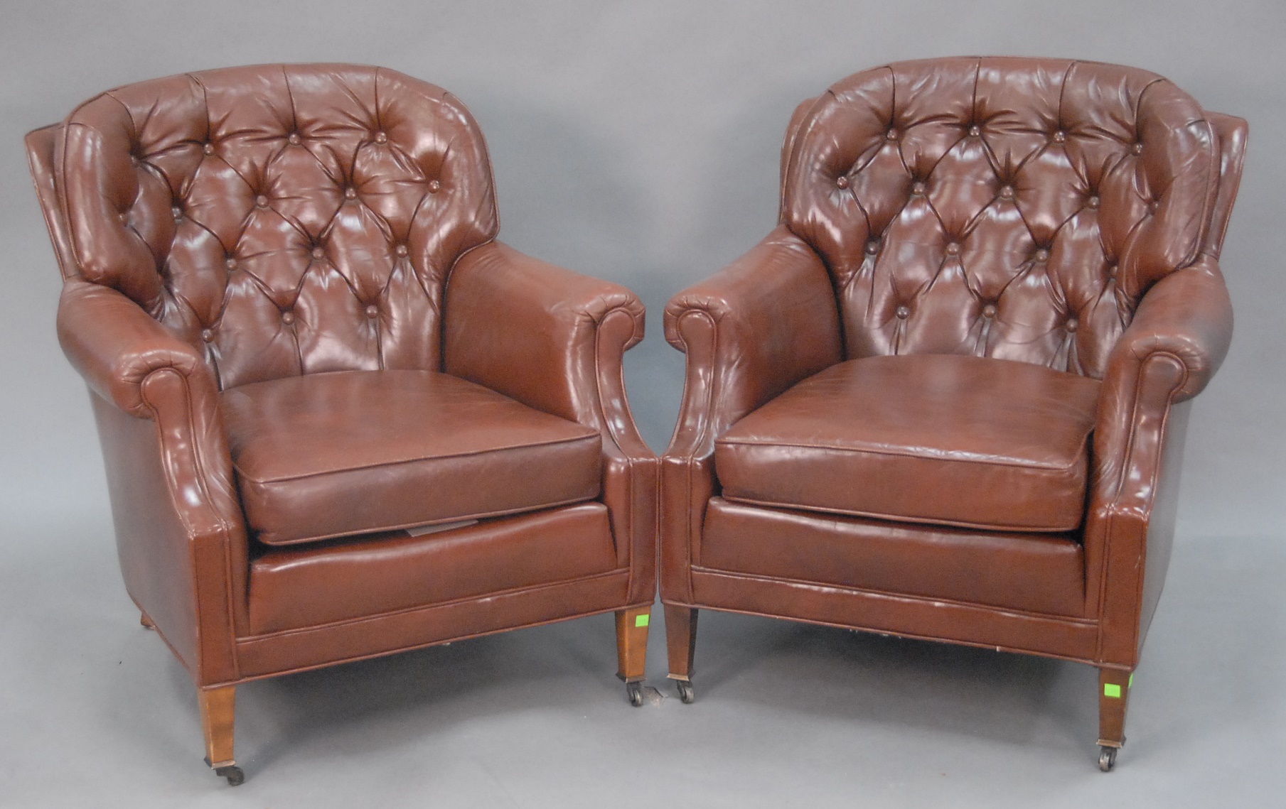 Pair of leather easy chairs with tufted backs signed Schafer Brother.