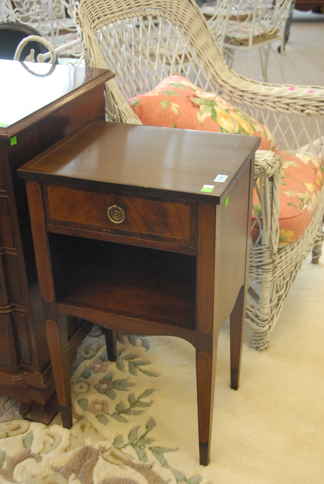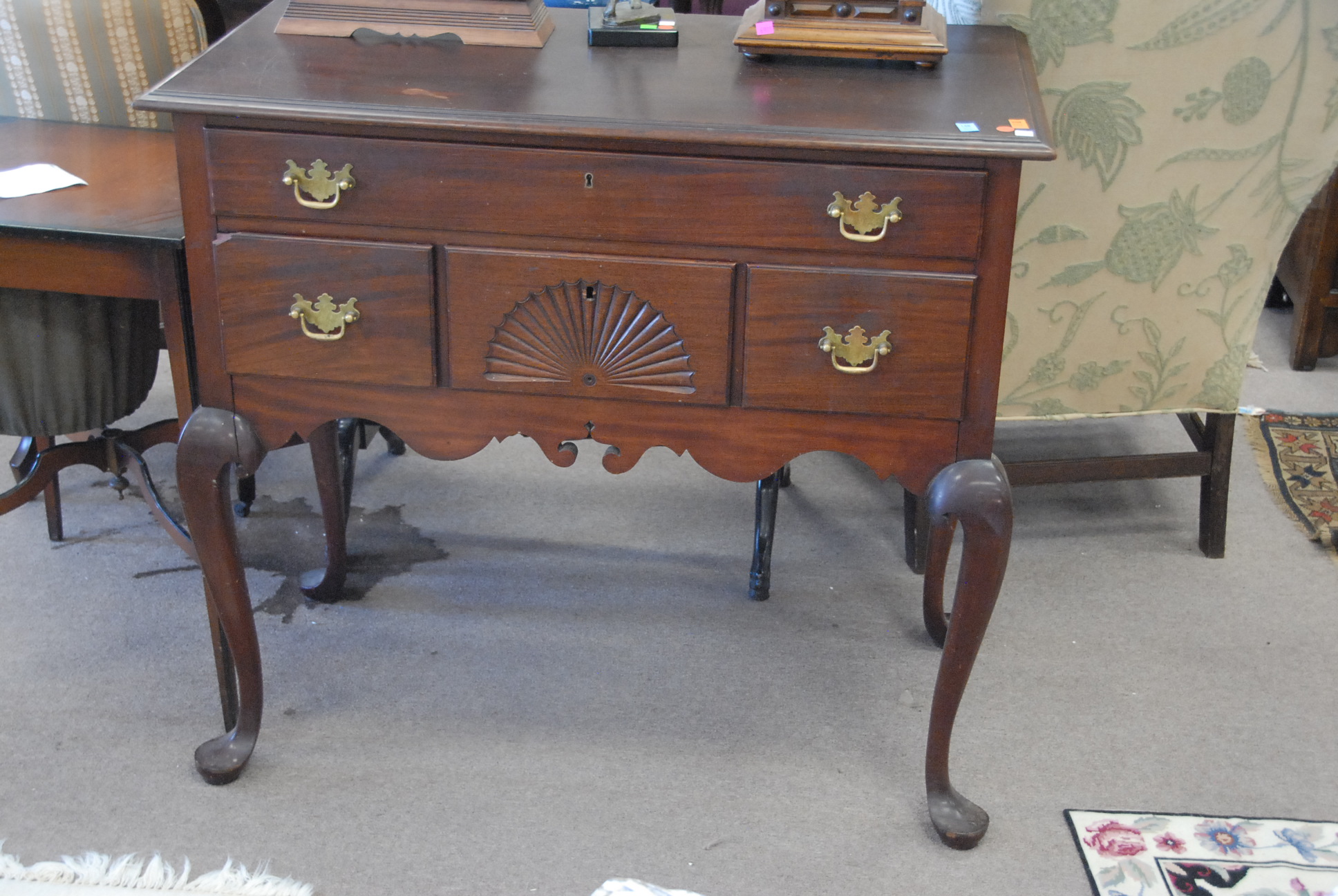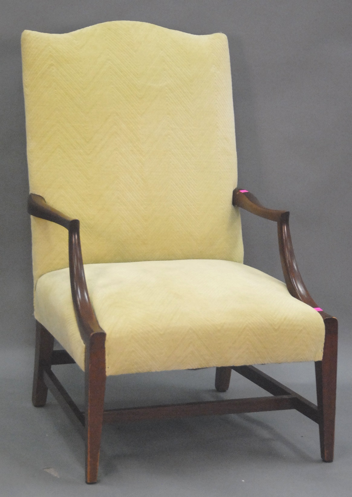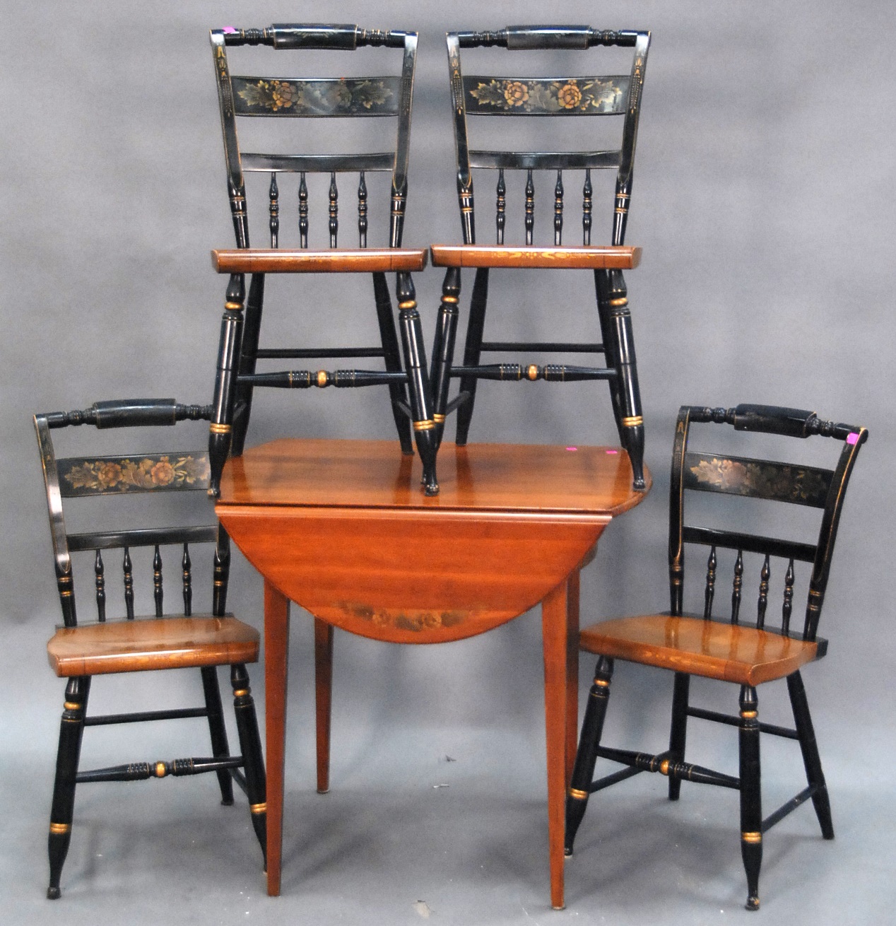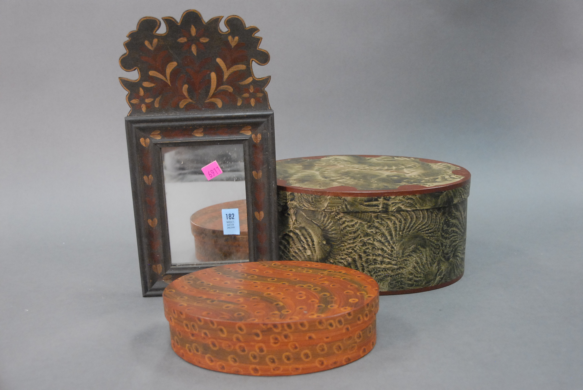 Three piece reproduction lot including Eldridge Wheeler Queen Anne style mirror and two paint decorated green oval boxes marked C. F. Hopf Kennebunk, Maine.