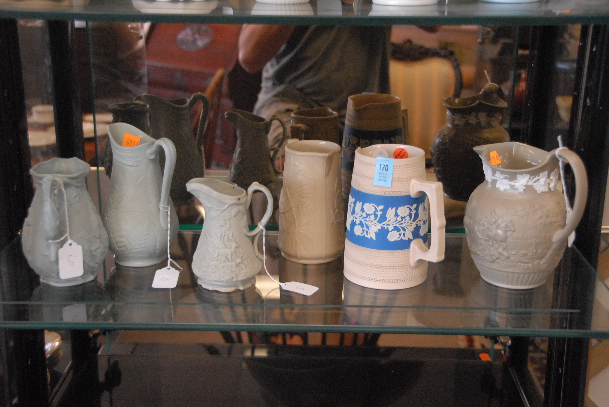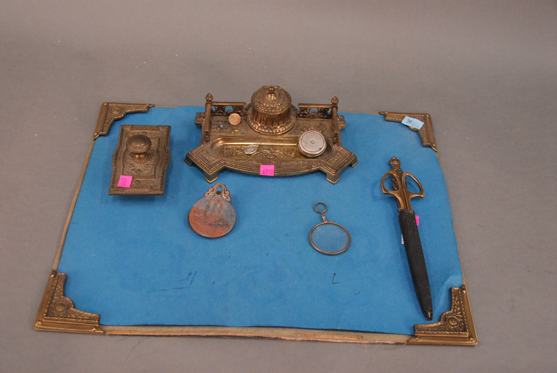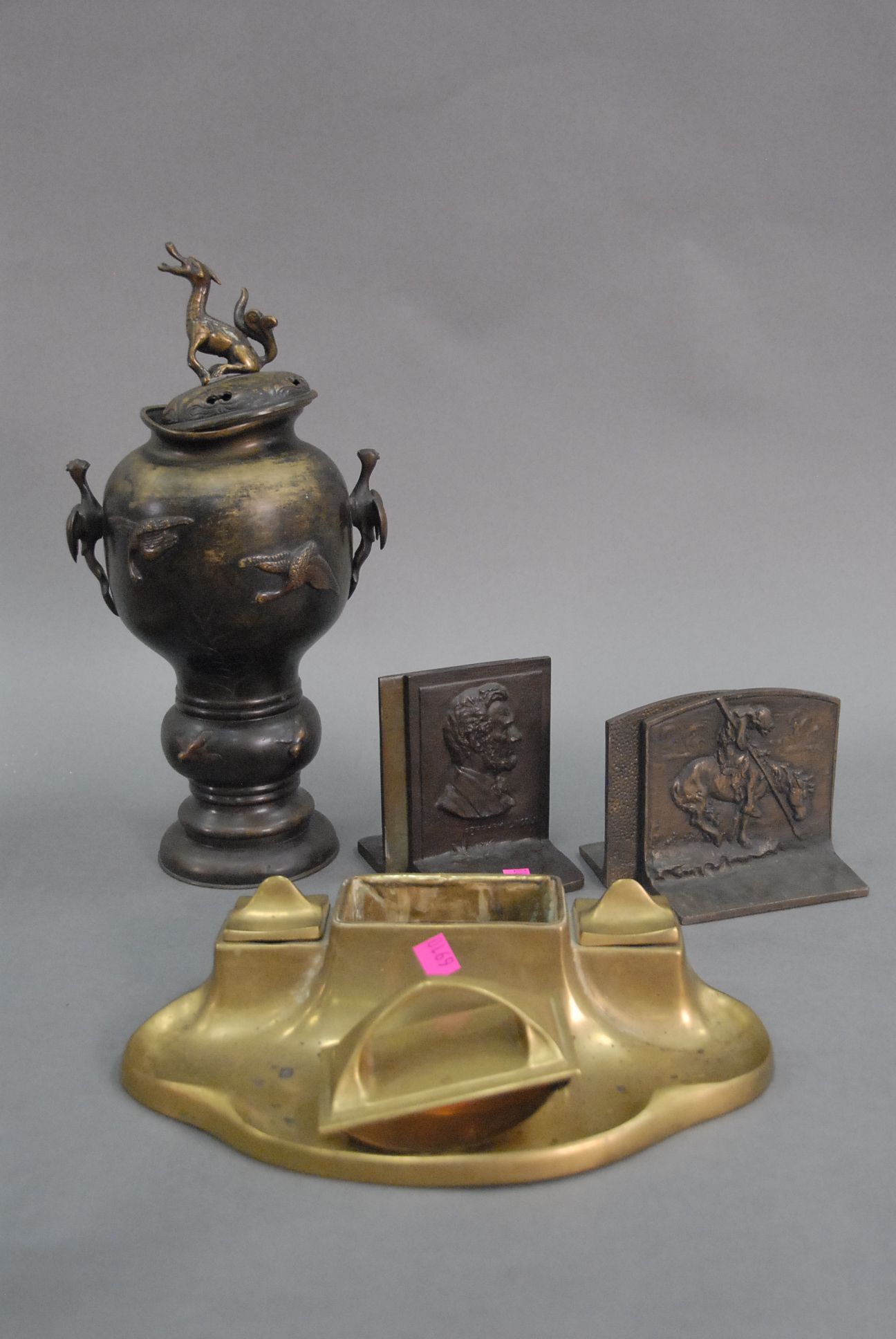 Group lot to include Japanese covered bronze urn, pair of bronze Abraham Lincoln bookends marked Cast by Griffoul Newark N.J., pair of Indian bookends, and pen tray desk set.