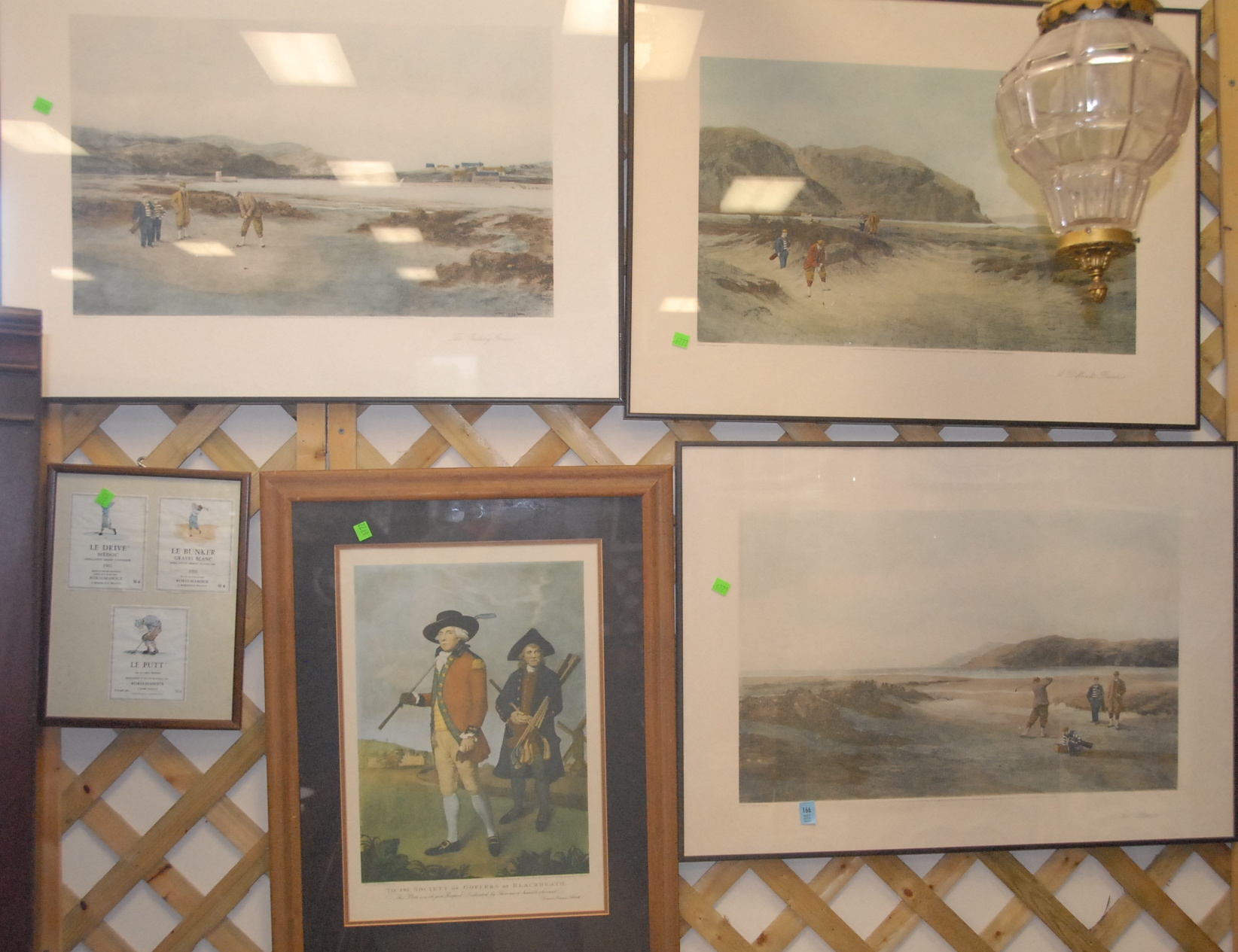 Five piece lot to of golf prints to include set of three The Drive, A Difficult Bunker, and The Pulling Green, and small framed wine labels Le Drive, Le Putt, and Le Bunker.