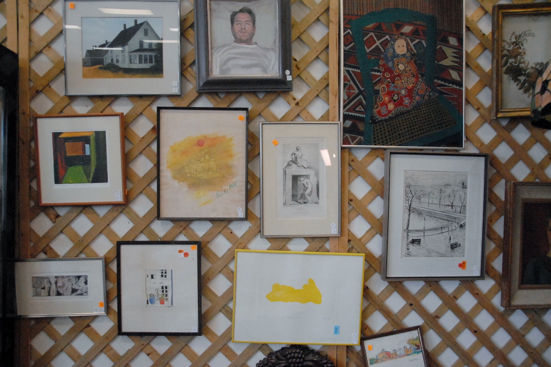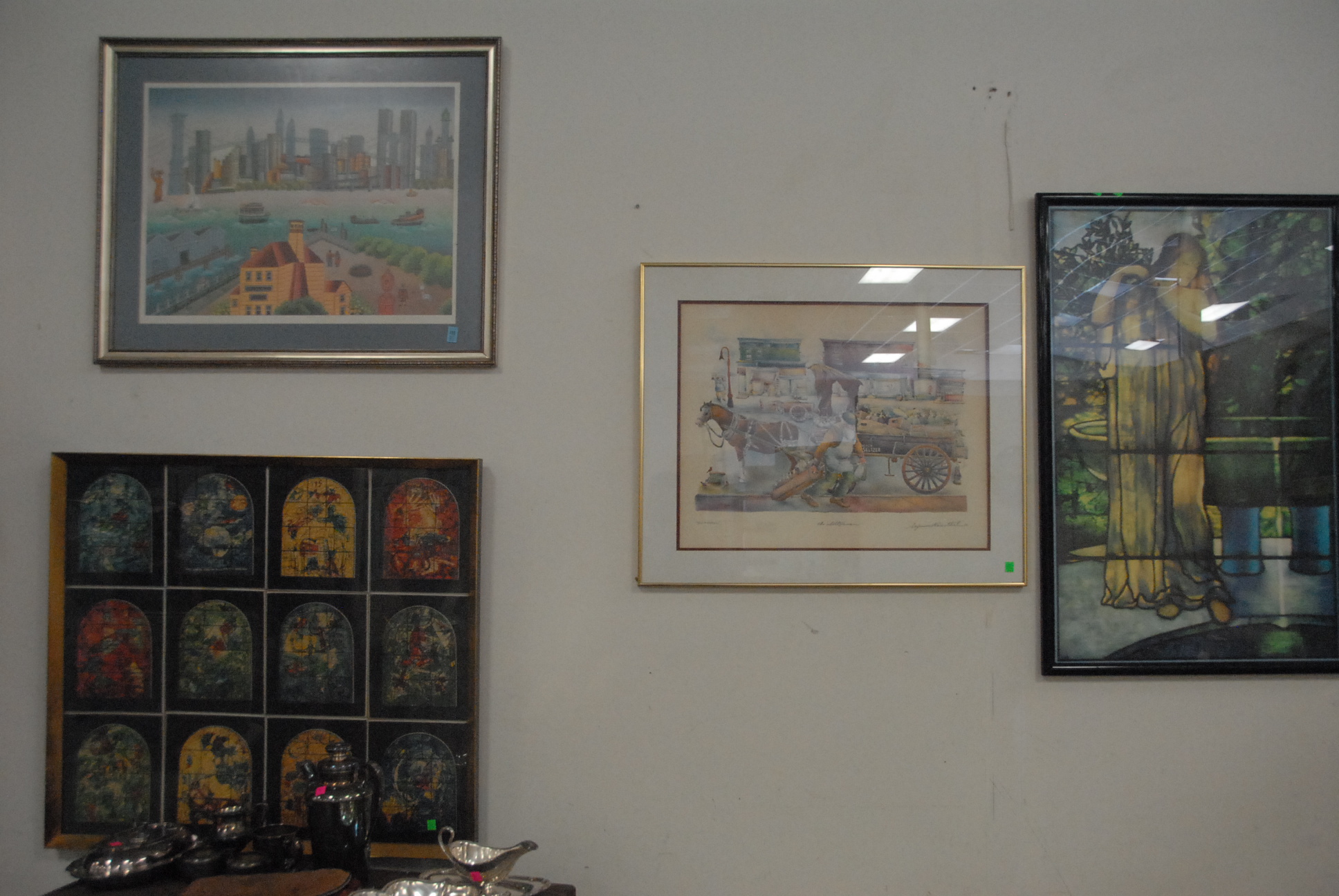 Group of four framed prints to include Gisela Fabian AP 60/75 NYC, set of twelve Chagall prints Windows of the World, Seymour Rosenthal The Seltzerman, and print of a woman.
