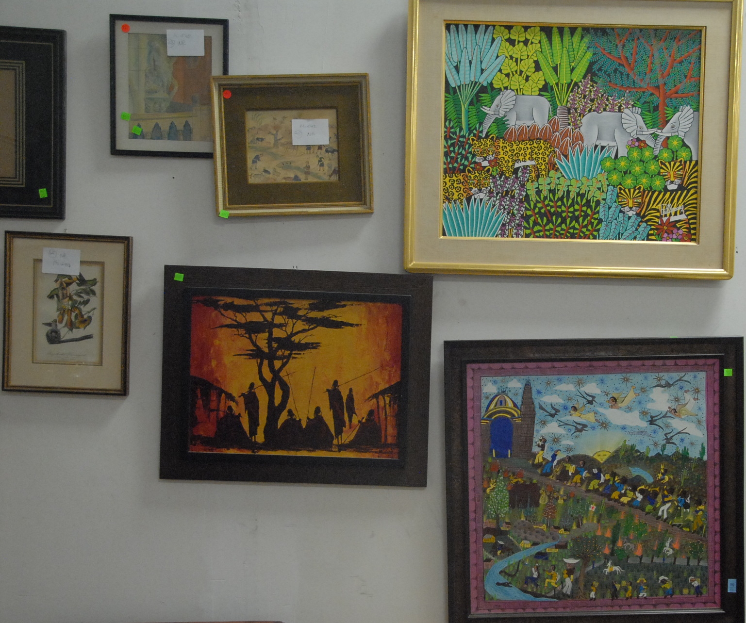 Group of six paintings to include watercolor signed Barnet 1953, Indian watercolor farming, an oil on canvas tribal scene signed lower right Muanza, large oil on canvas of jungle with elephants singed lower right Paul Memours, pastel of a girl signed lower right, and an oil on board of people working signed B-C Juan Camilo Agala.
