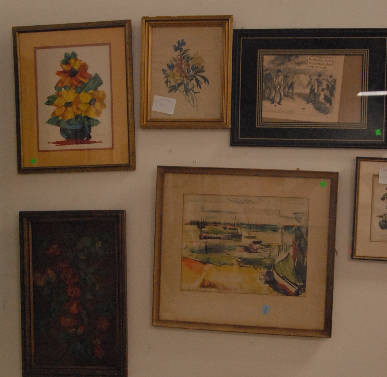 Group of watercolors and prints to include a watercolor of boats signed lower left Knight, black and white print, still life of flowers signed Dallaglio, ruby throated hummingbird print, watercolor still life of flowers signed Marianne, and an oil on board of apples.