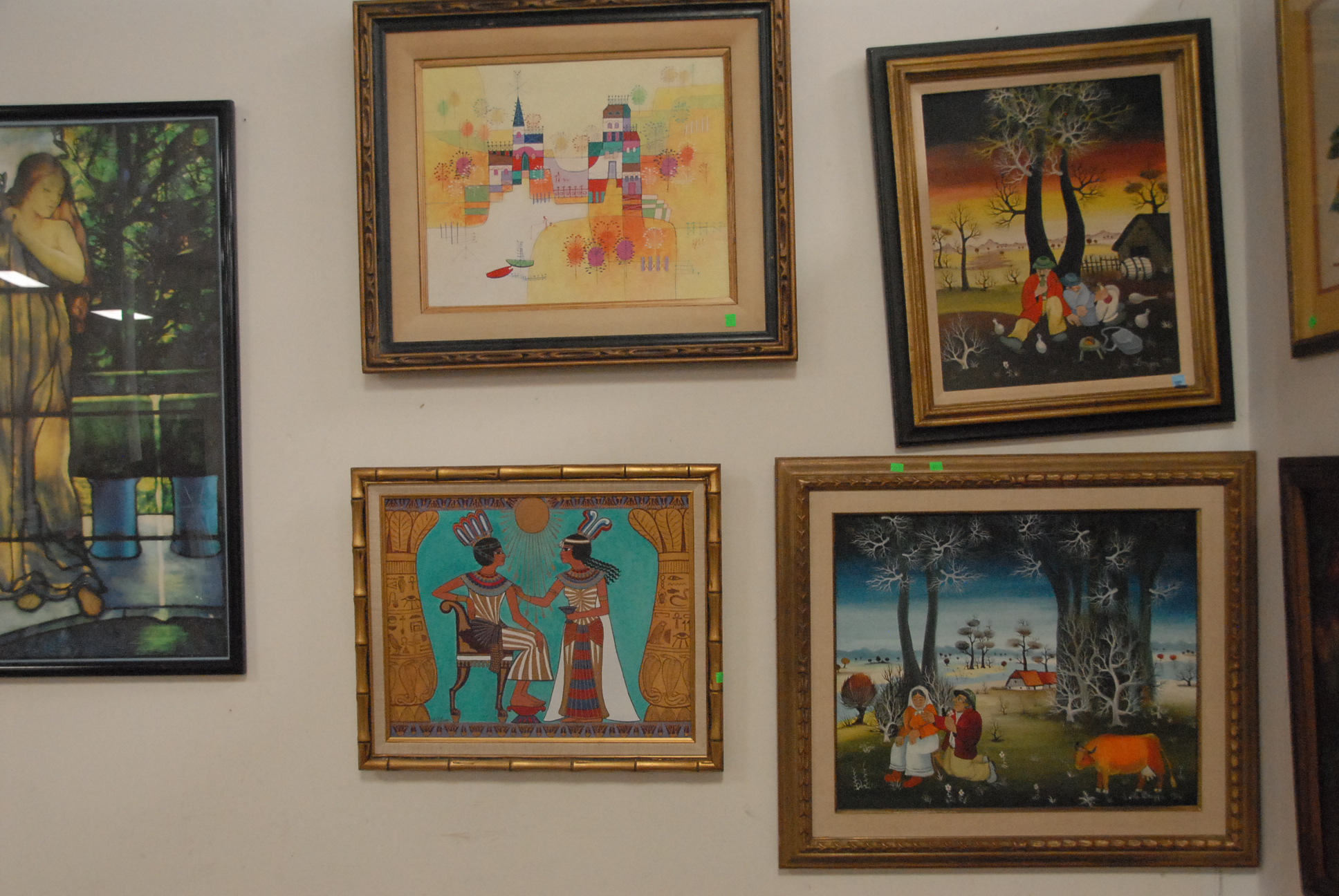 Group of four modern oil paintings to include two oil on board paintings signed lower right M. Dragya 1074 of abstract farm scenes, an oil on canvas modern cityscape, and an oil on canvas of two Egyptians.