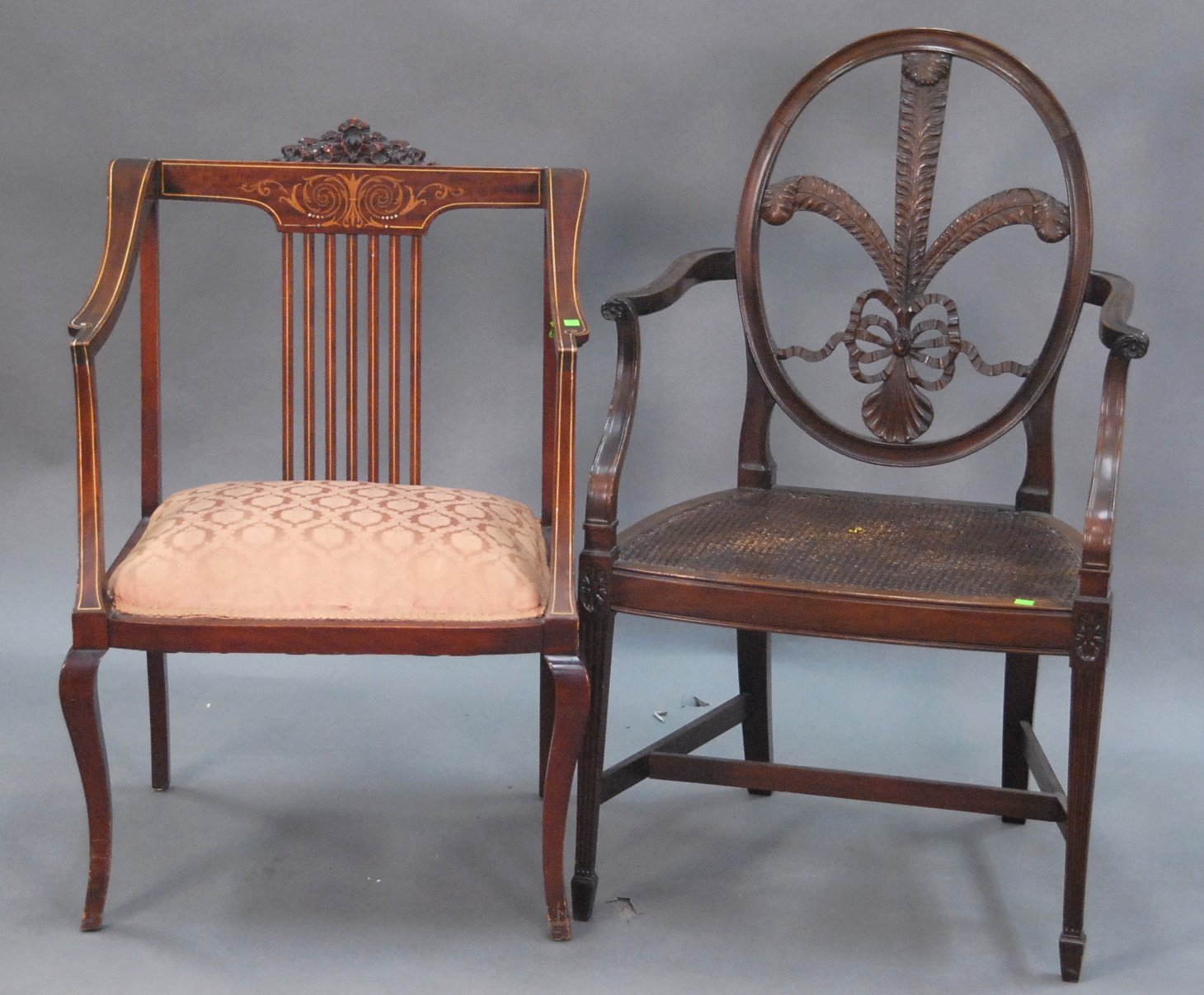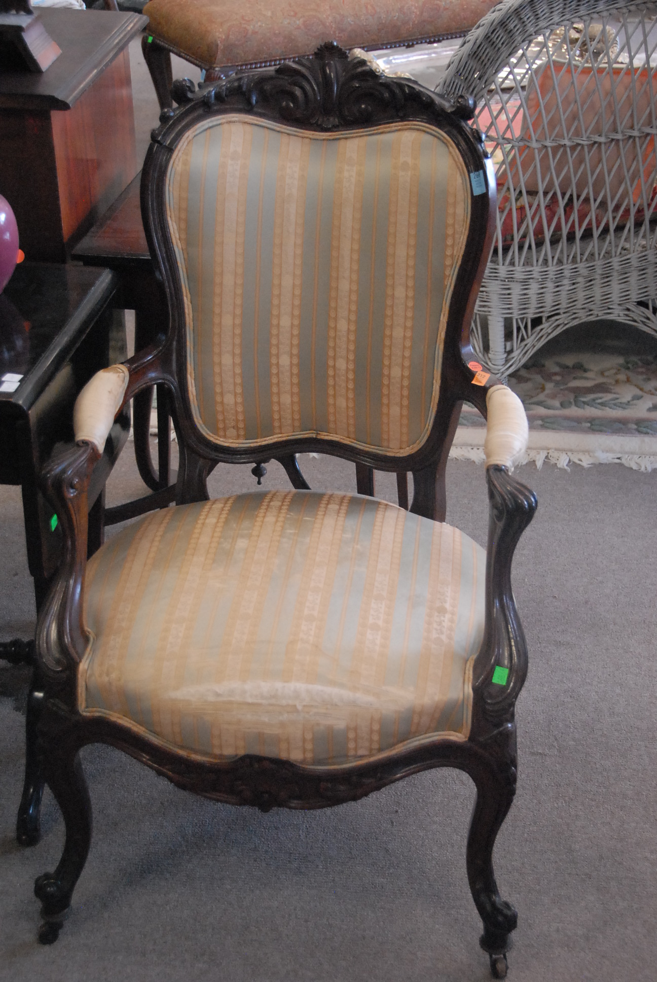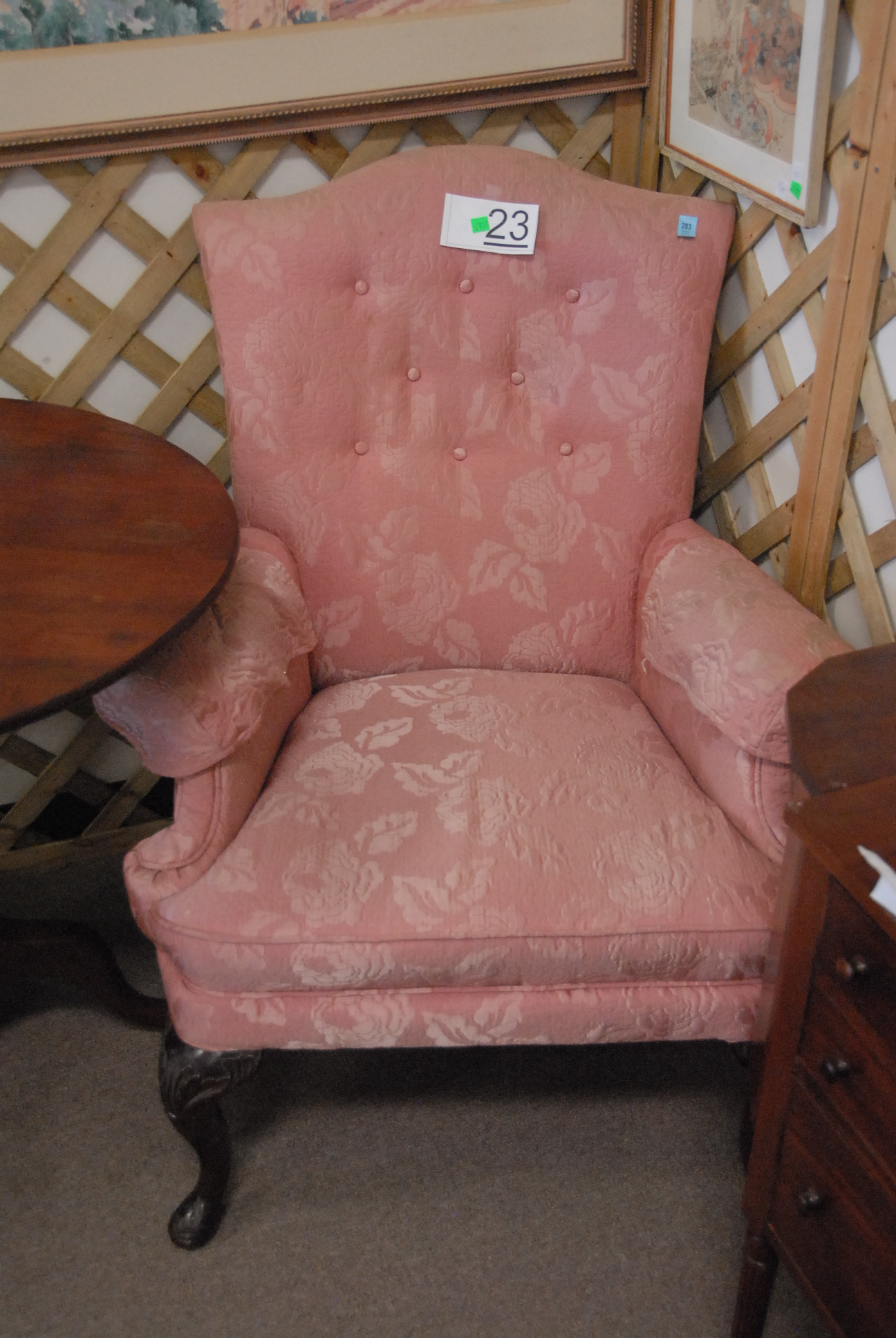 Queen Anne style upholstered armchair and mahogany sewing stand.