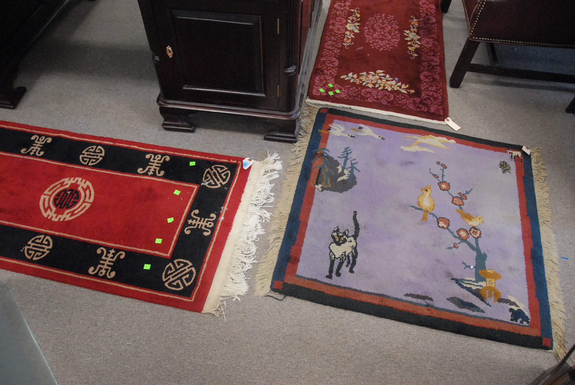 Group of five handmade Oriental rugs, four are Chinese, one has cat and birds.