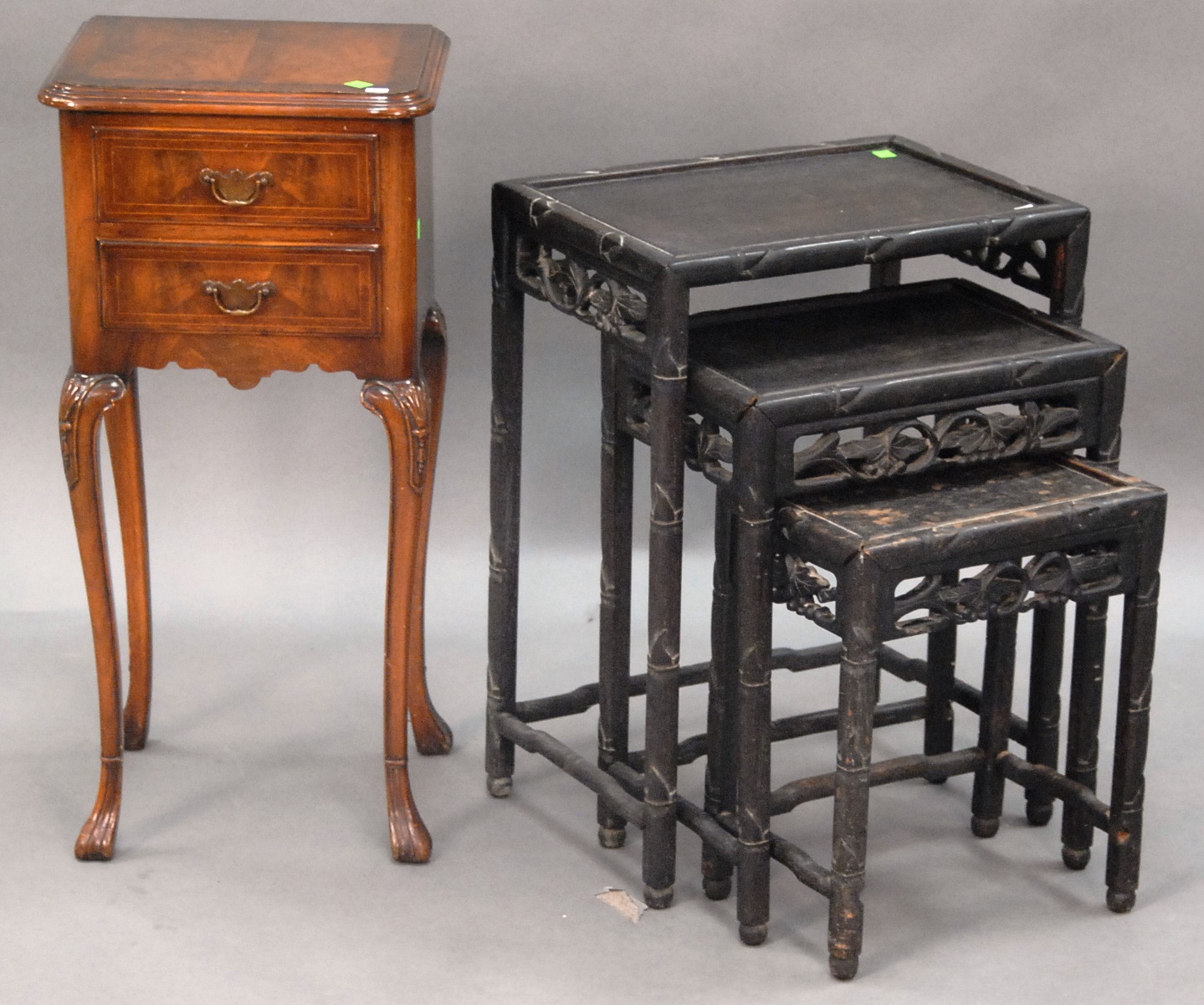 Group to include nest of three teak Chinese tables and small walnut two drawer stand.