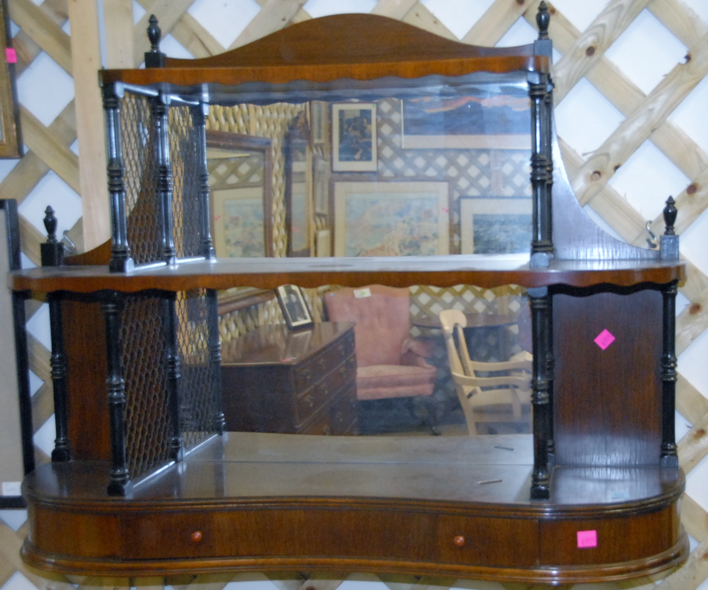 Mahogany mirrored hanging shelf with drawer.