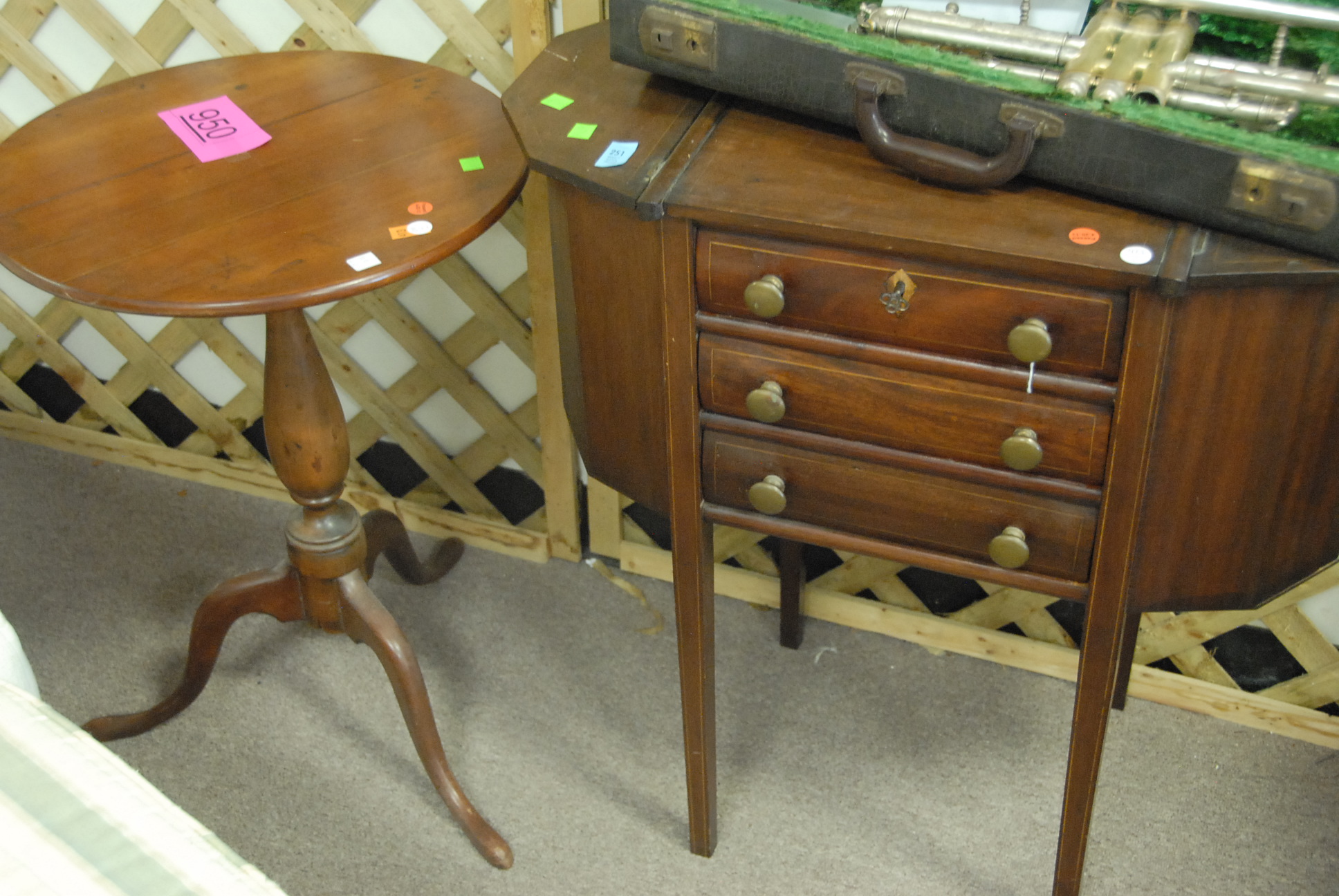 Two piece lot: cherry round candlestand and Martha Washington style sewing stand. Provenance: Estate of Nancy Sachse, Hamden, Connecticut