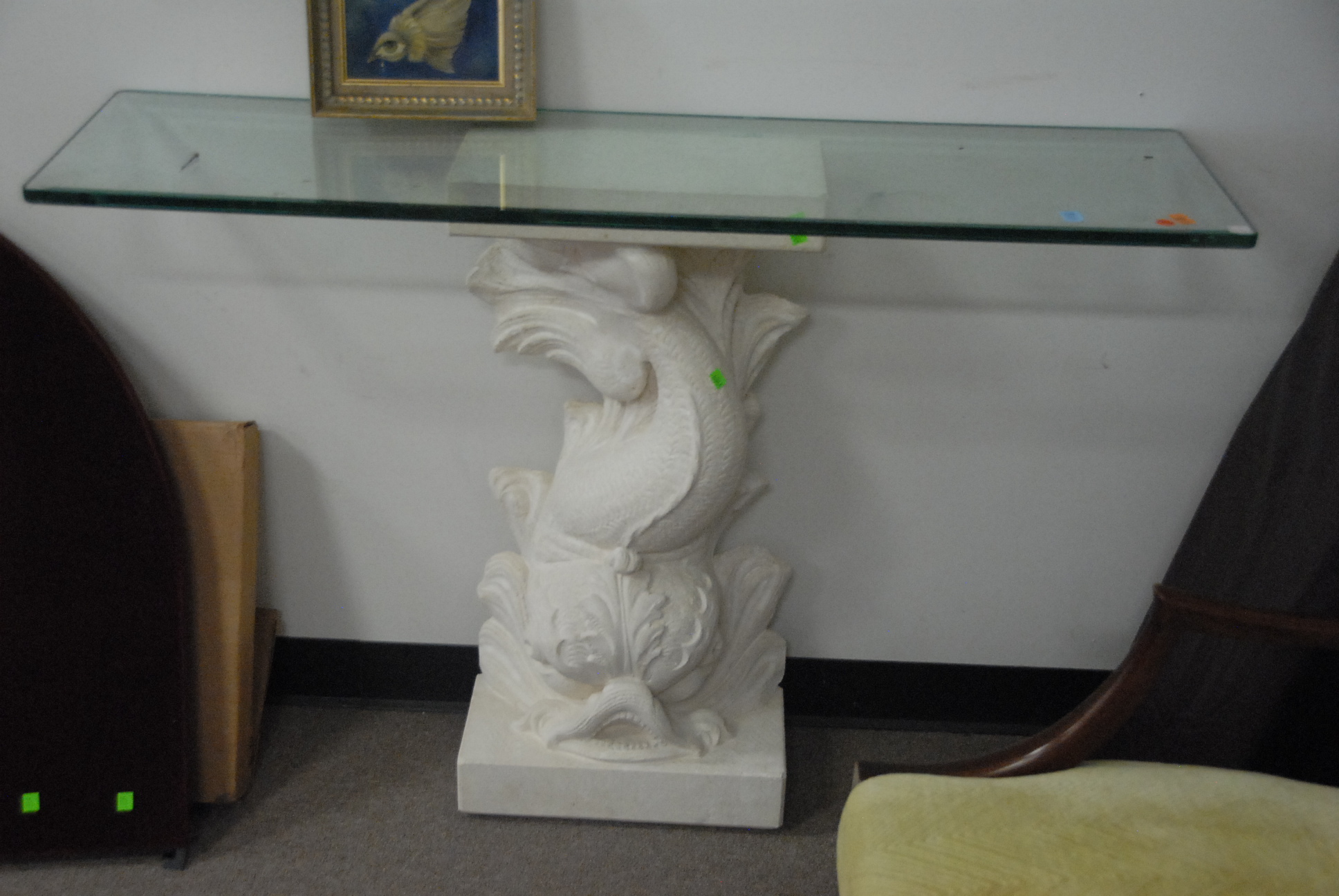 Glass top hall table with dolphin base.