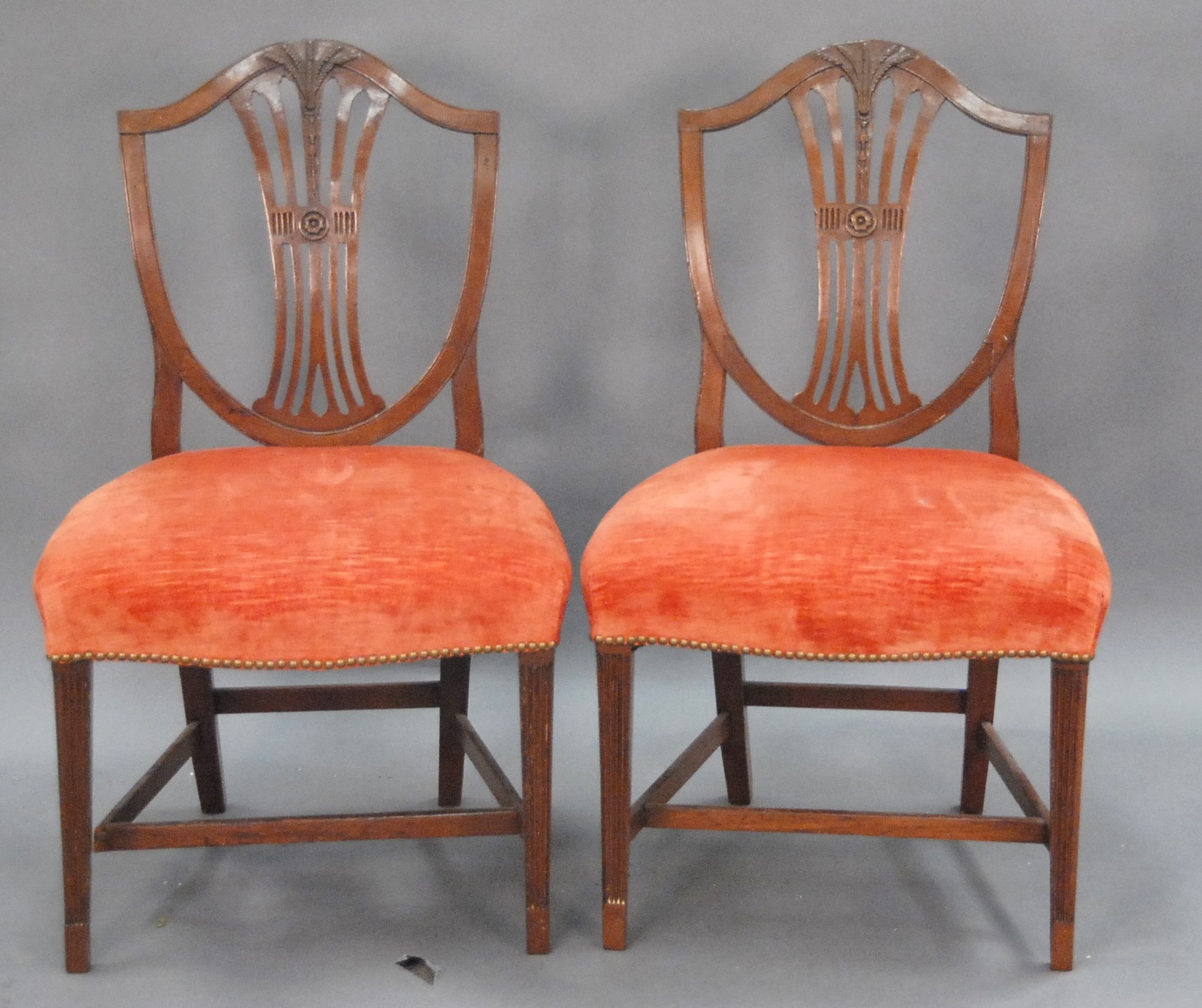 Pair of early Federal mahogany side chairs, one stretcher as is, circa 1790-1810