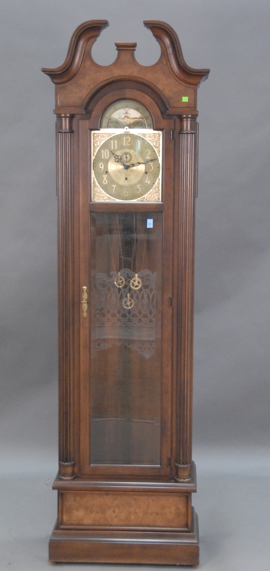 Contemporary tall case clock triple brass weights and brass pendulum, ht. 80in.