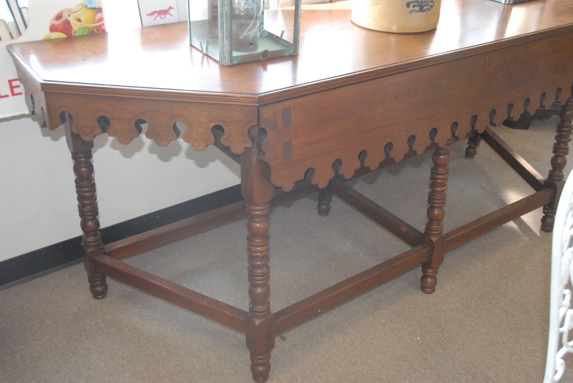 Walnut hall table with scalloped apron, ht. 33in. lg. 81in.