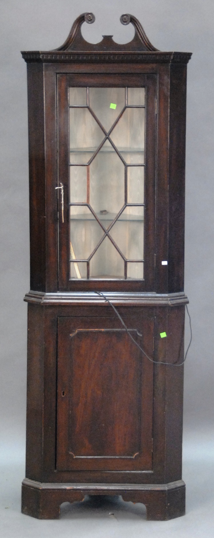 Mahogany corner china cabinet in two parts, ht. 75in.